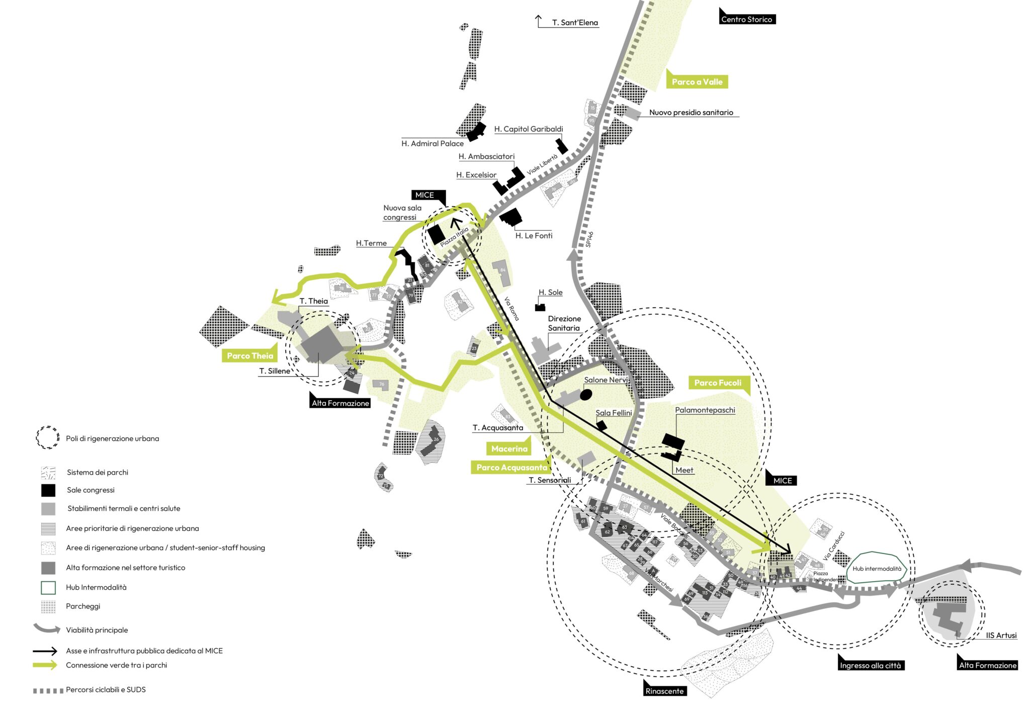 Il piano prevede interventi mirati di demolizione, ristrutturazione e sviluppo di nuove aree edificabili, con l’obiettivo di riqualificare il territorio comunale attraverso poli di rigenerazione urbana individuati come strategici. Una mappa complessiva che mette al centro il miglioramento della viabilità, dei parcheggi, delle connessioni verdi tra i parchi cittadini e la realizzazione di infrastrutture dedicate al MICE (Meetings, Incentives, Conferences and Exhibitions), a centri salute e a nuovi modelli abitativi come senior housing, staff housing e co-housing.