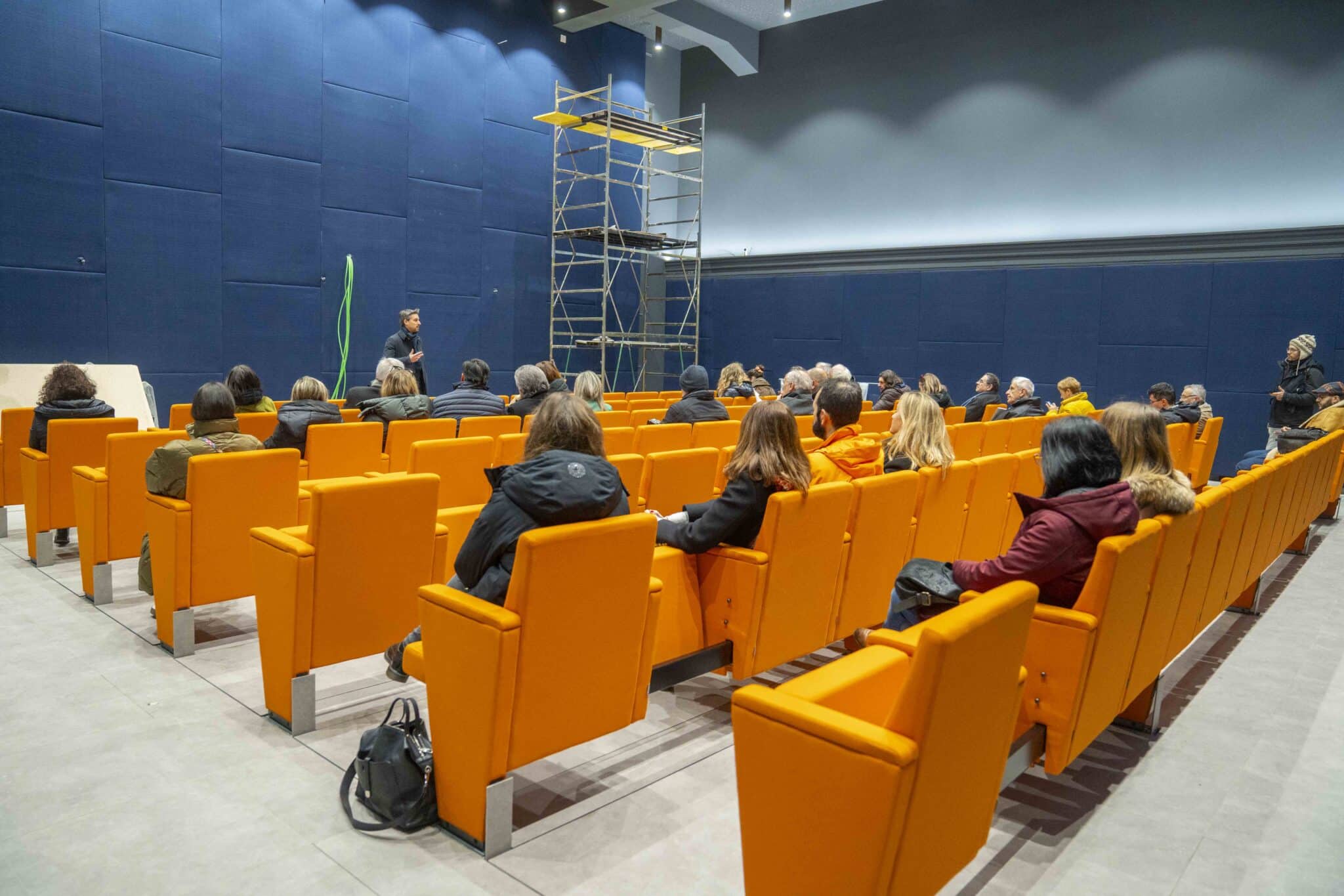 Particolarità della sala è un avanzato sistema di sedute a scomparsa, grazie al quale le poltrone possono scomparire sotto il pavimento, lasciando la sala libera di adattarsi a ospitare eventi che non necessitino di sedute, rimodulandosi in base alle esigenze.