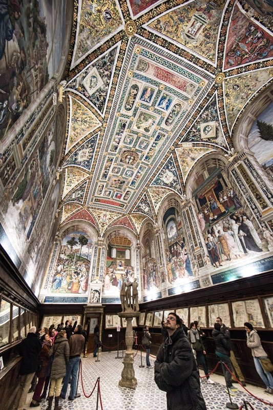 Perla dell’itinerario la Libreria Piccolomini oggetto negli ultimi anni di un importante lavoro di restauro sotto l’Alta Sorveglianza della Soprintendenza Archeologia Belle Arti e Paesaggio per le province di Siena Grosseto e Arezzo, che hanno ridonato splendore agli apparati di questo scrigno prezioso. Il restauro ligneo ha riguardato i banconi e le teche mentre quello lapideo il portale interno e la soprastante edicola.