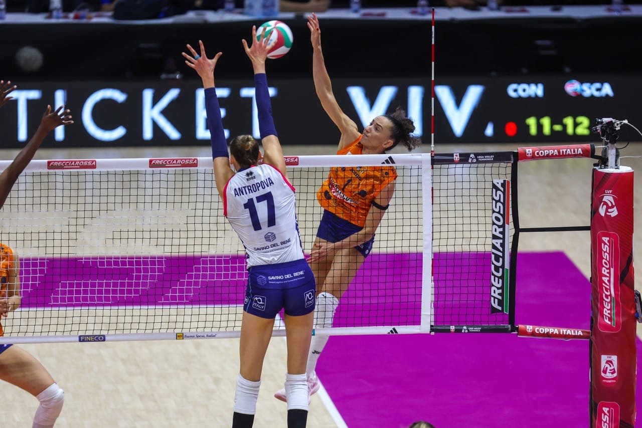 All’Inalpi Arena, davanti a oltre 12mila spettatori, la Savino Del Bene Volley gioca una finale vera, fatta di ritmo, intensità, personalità. Tiene il campo, risponde colpo su colpo, costruisce vantaggi, li difende, li perde e li ricostruisce. Ma alla fine paga la lucidità nei momenti decisivi e anche le condizioni fisiche non perfette di Ekaterina Antropova, visibilmente affaticata, comunque capace di 16 punti ma meno incisiva del solito nei frangenti che pesano.
