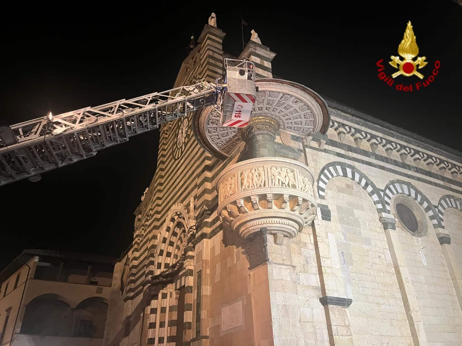 I vigili del fuoco sono intervenuti con l’autoscala e hanno provveduto al recupero della formella, che come hanno spiegato non ha riportato danni, e poi hanno verificato se ci fossero altre parti pericolanti. La porzione recuperata è stata affidata al personale della Curia Vescovile per il restauro del pulpito. Ad aver causato il distacco della formella potrebbe essere stato il caldo.