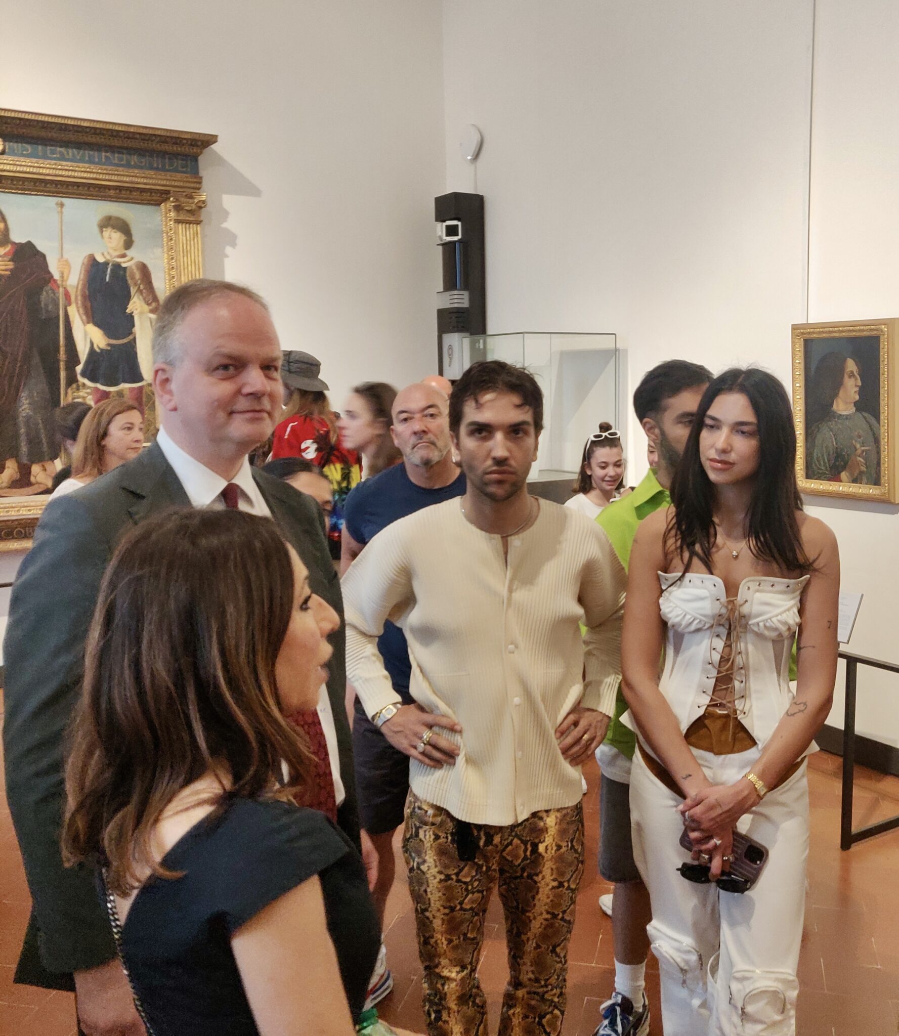 Quella di domenica 29 maggio è stata la prima volta di Dua Lipa agli Uffizi. Per lei una guida di eccezione, il direttore Eike Schmidt, che l’ha accompagnata sala per sala alla scoperta di tutti i capolavori dal primo Rinascimento e Botticelli fino a Caravaggio, passando per Leonardo, Raffaello, Bronzino e Tiziano.