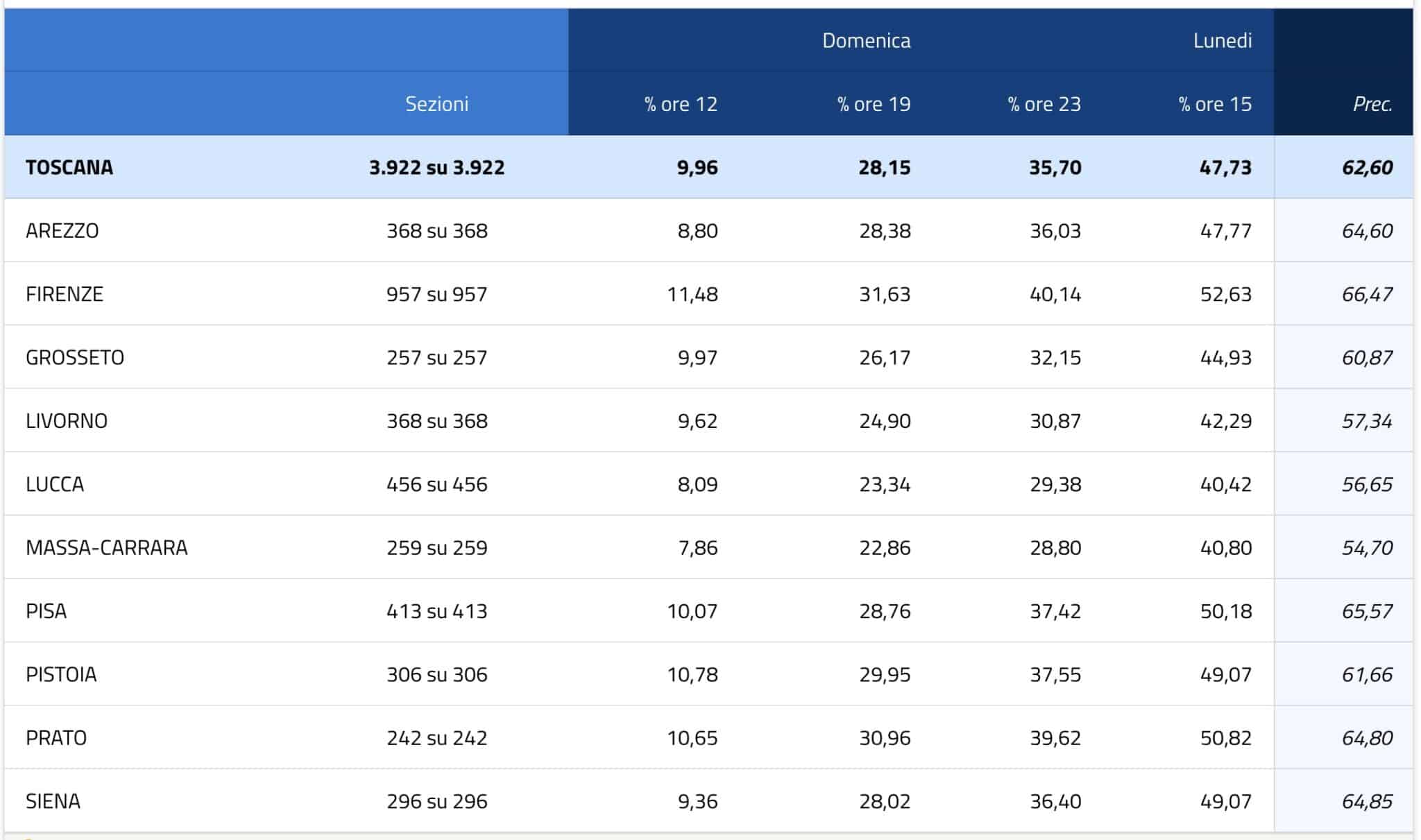 A circa la metà delle sezioni arrivate (1.937 su 3.922 complessive), in Toscana, ha votato il 46,9% degli aventi diritto. Nel 2020, prendendo in considerazione le stesse sezioni, aveva votato complessivamente il 61,77%, circa il 14% in più. Nel 2020 l’affluenza finale arrivò al 62,60%.