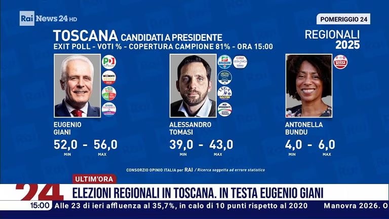 Il presidente della Toscana ricandidato per il centrosinistra Eugenio Giani al 56,6%, lo sfidante del centrodestra Alessandro Tomasi al 38,8%, Antonella Bundu (Toscana Rossa) al 4,6%. È quanto emerge dalla stima Youtrend per Sky TG24, basata sull’instant poll e sulle prime sezioni scrutinate.