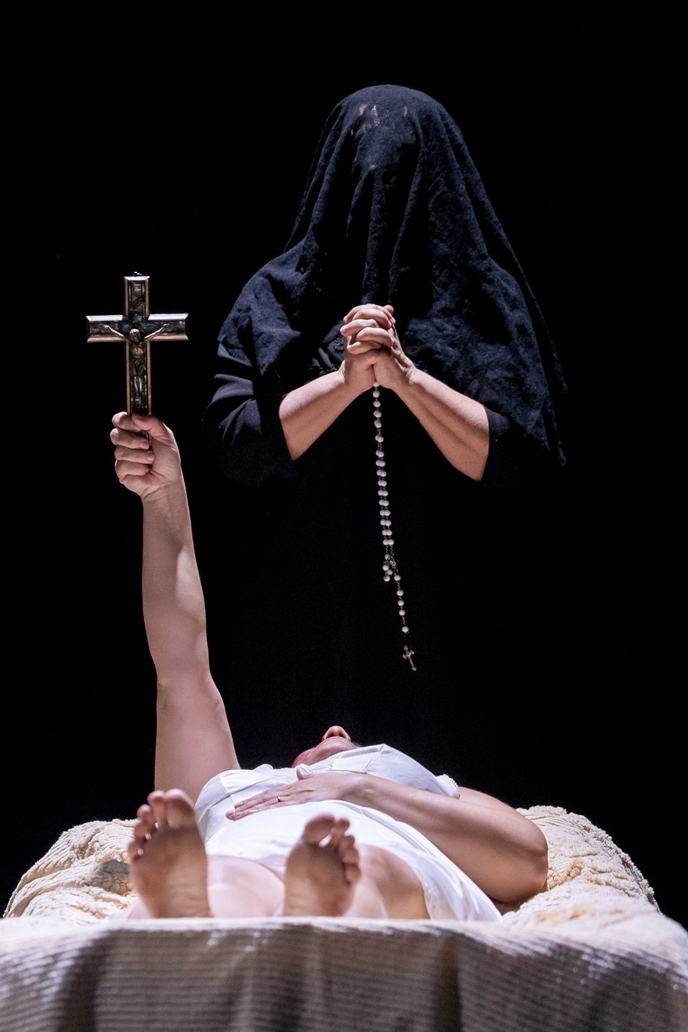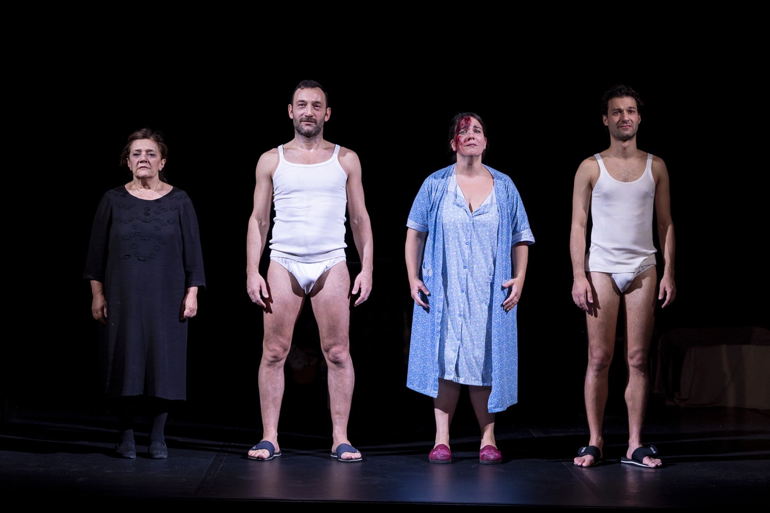 La Moglie non può morire, perché la sua morte fa parte di quella stessa routine. Quando viene uccisa dal Marito, il Figlio, la Suocera e il Marito stesso la richiamano in vita, le chiedono di alzarsi perché la giornata deve ricominciare, perché quella violenza e quella morte sono entrate nell’ordito del tessuto domestico. Questa famiglia vive mangiandosi, divorandosi a vicenda, uccidendosi, e il corpo della Moglie viene alla fine devastato da tanta violenza. Spesso, quando si parla della Sicilia, si dice “in Sicilia non c’è solo la mafia”. È una frase che mi ha sempre colpito molto: è vero, non c’è solo la mafia; però, negli atteggiamenti quotidiani delle persone, esiste l’atteggiamento mafioso che per me è anche peggiore: è un terreno fertile per produrre e creare quell’orrore – che poi è la mafia – di un comportamento patriarcale, prevaricatore, che da decenni, da secoli crea l’humus su cui attecchiscono morte, violenza, femminicidio. Dov’è il paradosso? Nel fatto che questa donna continuamente vessata, tormentata dall’atteggiamento del Marito che finisce per contaminare anche il Figlio, nonostante il pericolo costante in cui si trova, non riesce a staccarsi dalla casa. Esiste un legame morboso, inspiegabile, inesorabile – e non ha assolutamente a che fare con l’amore – per cui i quattro familiari non si possono lasciare. È qualcosa che ha a che fare con la sofferenza, che diventa debolezza, impossibilità di uscire da questa prigione. C’è un momento dello spettacolo che lo spiega precisamente, la scena in cui tutti i personaggi si stringono la mano fino a farsi male, se la stritolano, cercando di fuggire in direzioni opposte, ma creando invece una catena umana con la quale si tengono stretti nel dolore, nella sofferenza, nell’orrore.