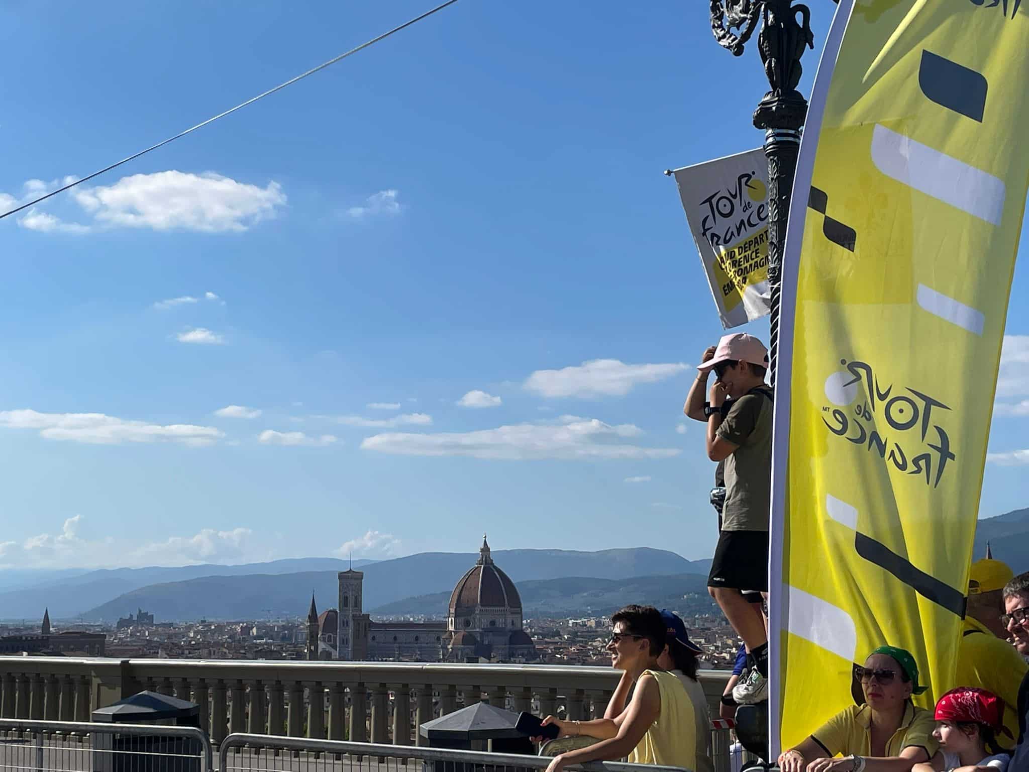 In migliaia attendono i campioni, c’è Mark Cavendish, Tadej Pogacar (vincitore del Giro d’Italia), Jonas Vingegaard e il toscano Alberto Bettiol. Tanti appassionati arrivati in bici, tutti con le magliette del Tour, molti con gli otto bus “navetta Bartali” di Autolinee Toscane, l’azienda del trasporto locale, che dalle 16 alle 21 ha collegato piazza Vittorio Veneto con il piazzale Michelangelo.