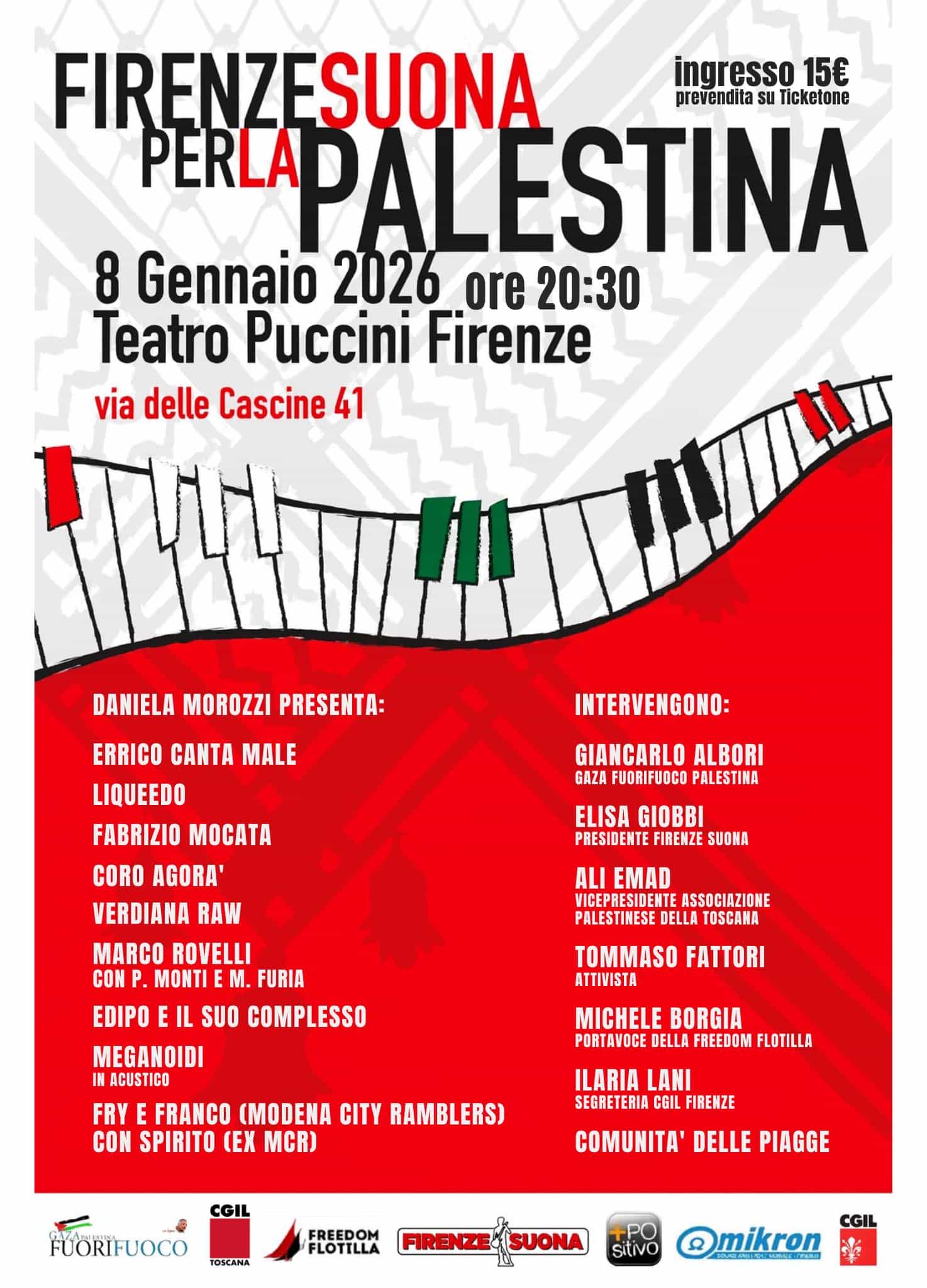 Accanto alla musica, spazio anche agli interventi di rappresentanti del mondo dell’associazionismo, dell’attivismo e del sindacato: Giancarlo Albori (Gaza Fuorifuoco), Elisa Giobbi (presidente Firenze Suona), Ali Emad (vicepresidente Associazione palestinese della Toscana), Tommaso Fattori (attivista), Michele Borgia (portavoce Freedom Flotilla), Ilaria Lami (Cgil Firenze) e la Comunità delle Piagge.