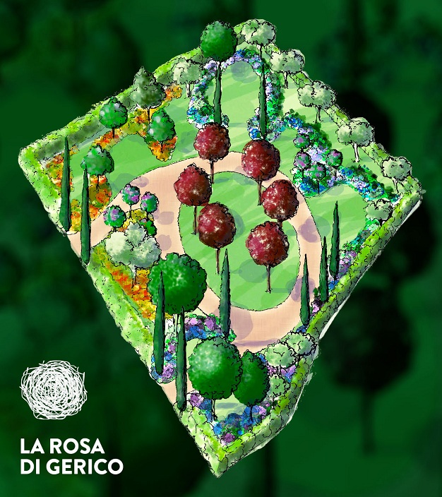 È stato chiamato Rosa di Gerico perché questo fiore rappresenta bene lo spirito del progetto: in natura è chiuso a riccio e sembra privo di vita, ma appena viene irrigato inizia subito a schiudersi e i rami tornano verdi. Per questo motivo è noto anche come la pianta della resurrezione o della rinascita. Il giardino è stato progettato dall’architetto di giardini Andrea Mati e realizzato dall’azienda vivaistica Mati 1909 e Alessandro Masetti, partner dell’iniziativa. Occupa un’area di 800 mq all’interno della proprietà, poco meno di un ettaro coltivato a frutteto e ortaggi con la presenza di una serra riscaldata di 250 mq, di una fredda di 160 e dell’asina Agnese, mascotte insieme alla capra Nina.