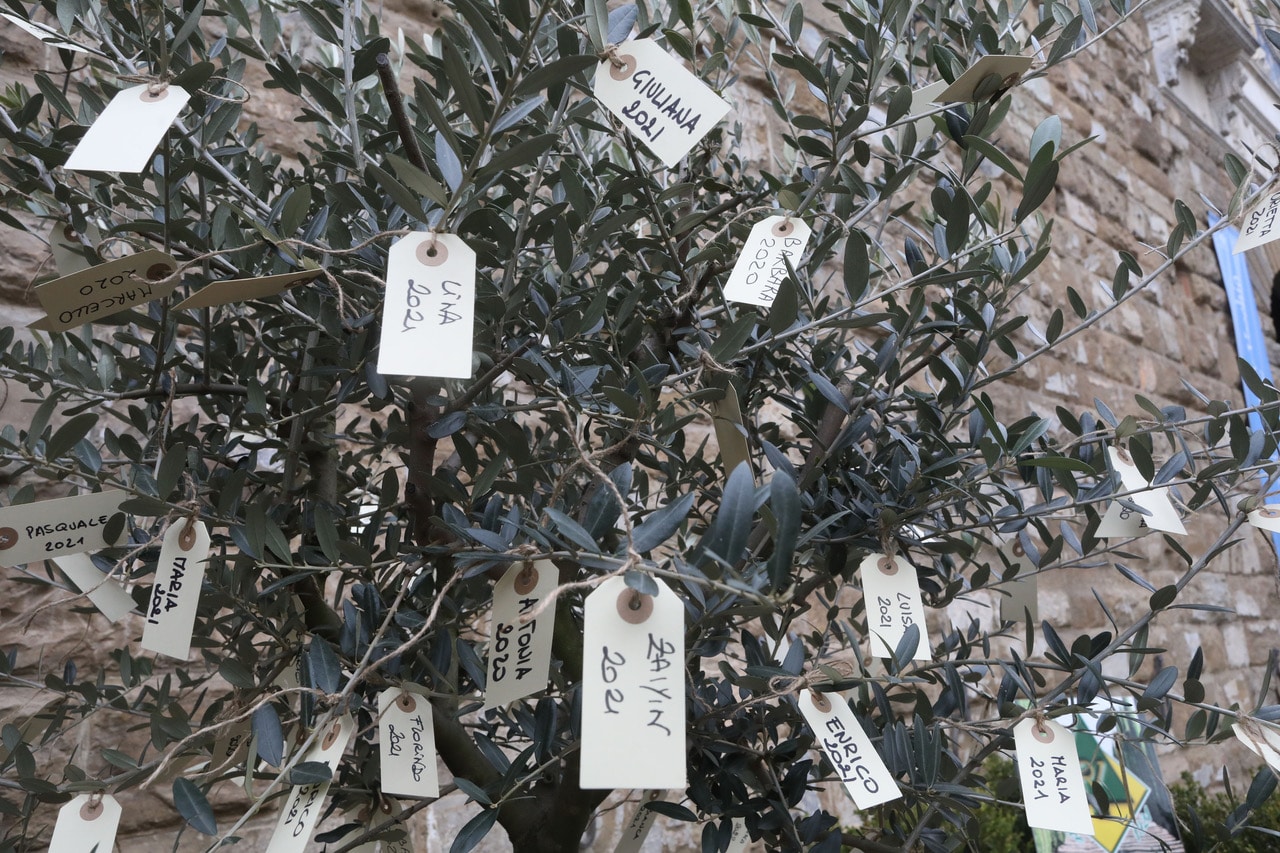 I nomi delle vittime del Covid-19 sulle foglie d’ulivo. Un gesto simbolico per ricordare il tributo di oltre mille vite pagato dalla città di Firenze in questi due anni di pandemia. Gli alberi di ulivo con il loro carico di ricordi sono stati disposti sull’arengario di Palazzo Vecchio.
