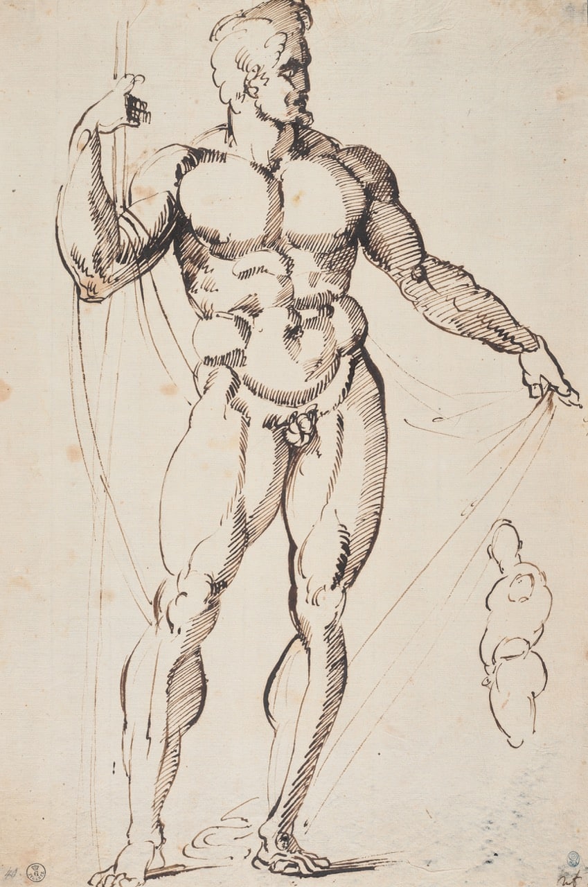 I tre disegni del maestro fiorentino — autore del celebre Laocoonte che accoglie i visitatori alla fine del Terzo Corridoio della Galleria — raffigurano corpi maschili dalle muscolature possenti, studi di braccia e figure mitologiche identificabili con Ercole. Nella mostra diventeranno gli “antenati” dei combattenti apocalittici immaginati da Hara, in un confronto diretto tra due linguaggi artistici distanti mezzo millennio ma uniti dalla stessa tensione estetica.