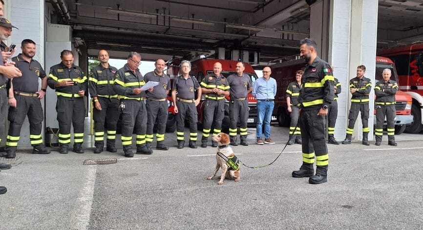 Si congeda dopo sei anni di onorato servizio tra le ricerche dopo il crollo del ponte Morandi e l’emergenza terremoto in Albania nel 2019. La cagnolina Foglia lascia l’unità cinofila del comando dei vigili del fuoco di Prato e si prepara al meritato riposo.