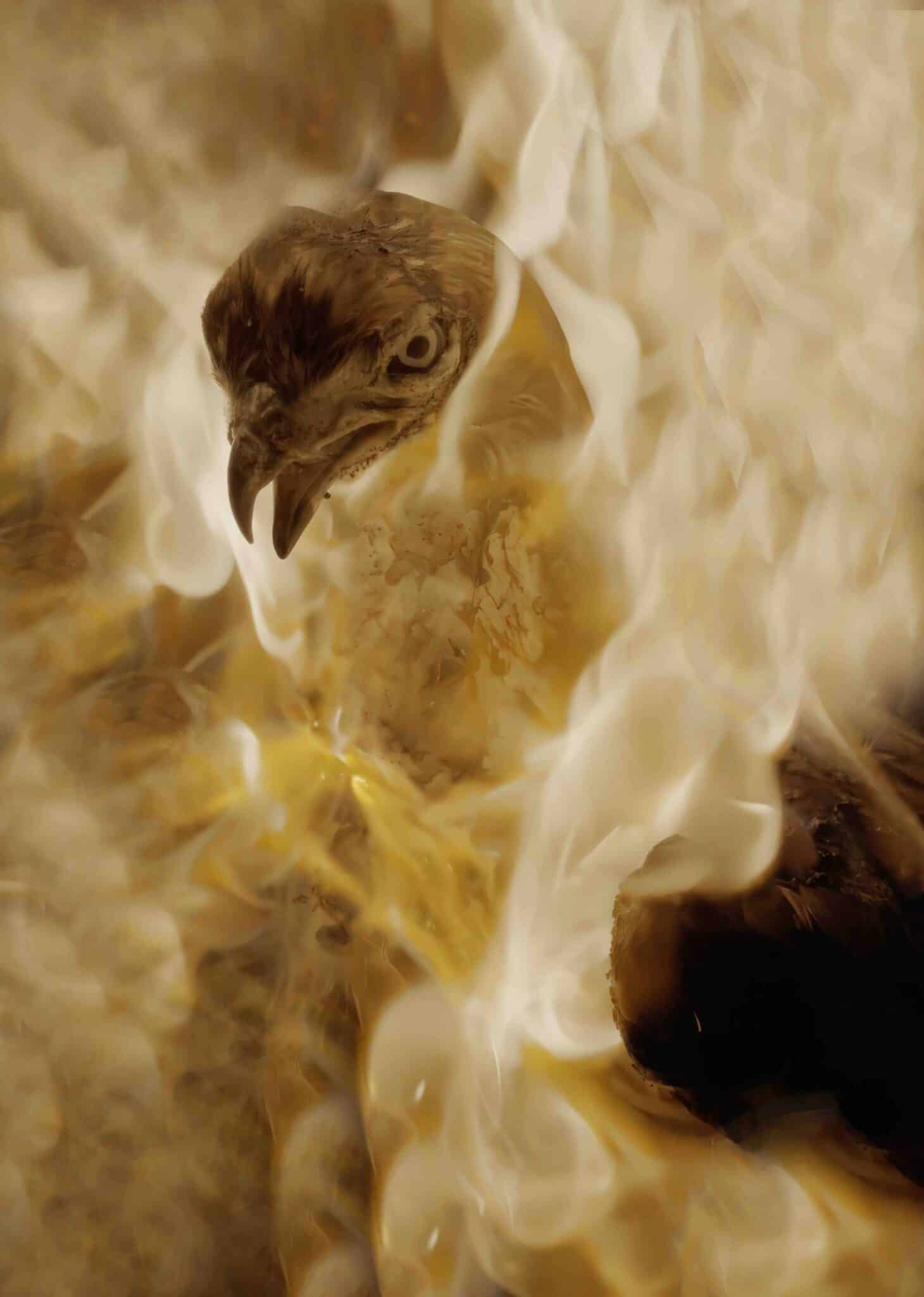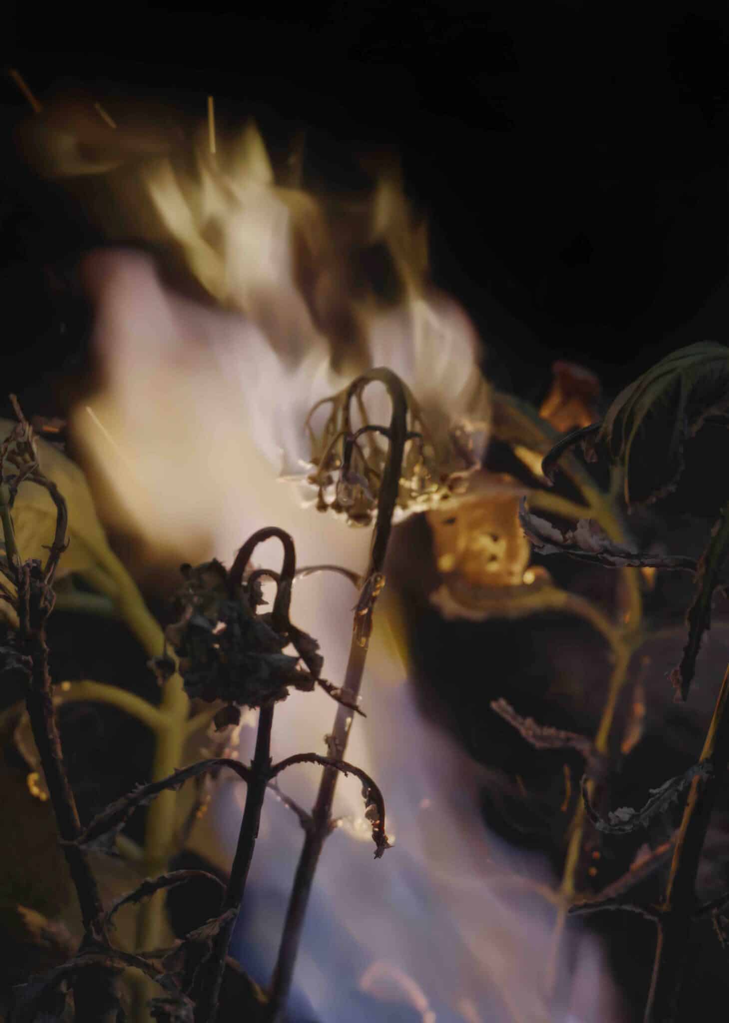 Oggetti comuni, elementi naturali e presenze animali diventano segni di un mondo in perenne oscillazione, fatto di frutti in decomposizione, fiori e creature avvolte dalle fiamme, recinzioni e barriere che suggeriscono un ambiente inafferrabile e inquieto.
