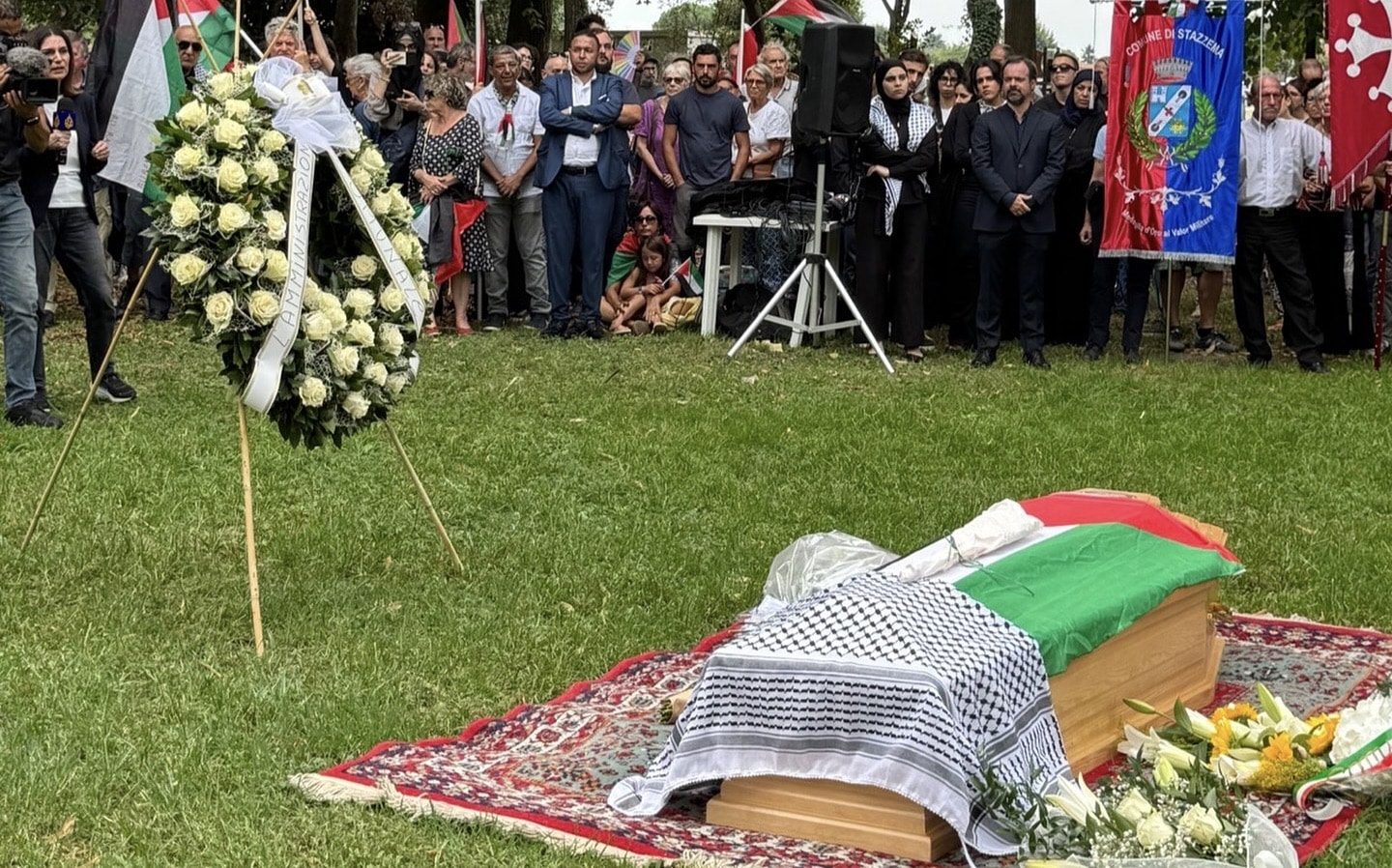 Molte le persone presenti per dare l’ultimo saluto a Marah, tante bandiere dello Stato Palestinese e i gonfaloni di tanti Comuni, da quello di San Giuliano Terme a quello di Pisa e di Stazzema, in un ideale comunanza di valori e dolore.