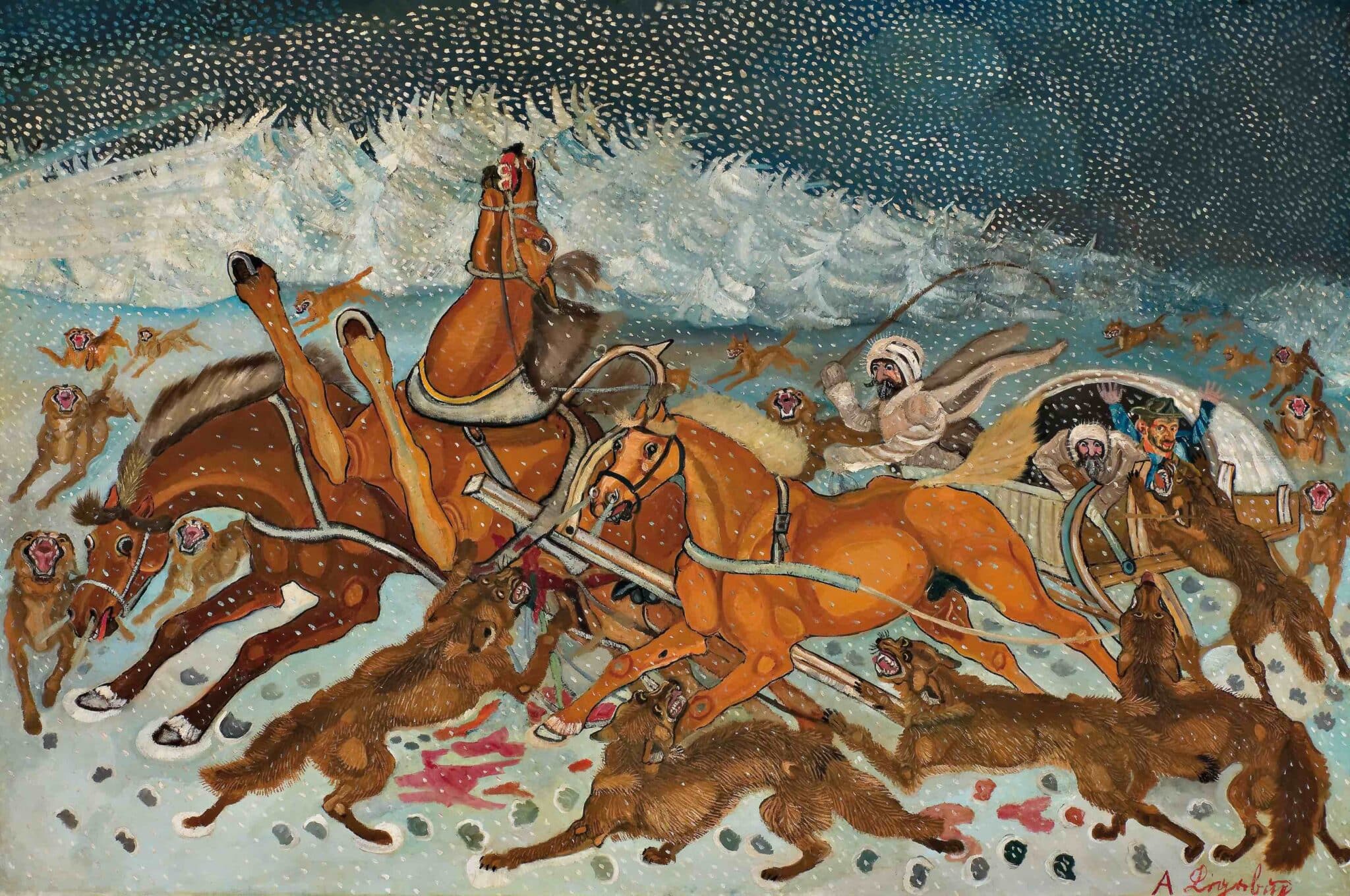 Il percorso si amplia poi verso visioni più immaginifiche e corali: giungle mai viste ma intensamente immaginate, scene epiche di uomini e animali uniti dalla fatica e dal destino, come in Traversata della Siberia.