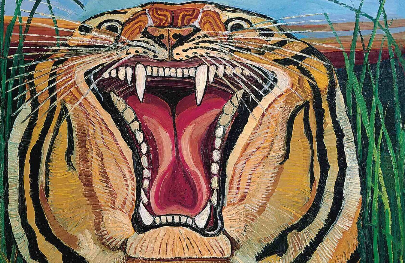 Il titolo della mostra allude al cuore della sua poetica: quel “ruggito” interiore che prende forma nelle immagini di animali feroci, nei colori accesi e nelle composizioni cariche di tensione emotiva.