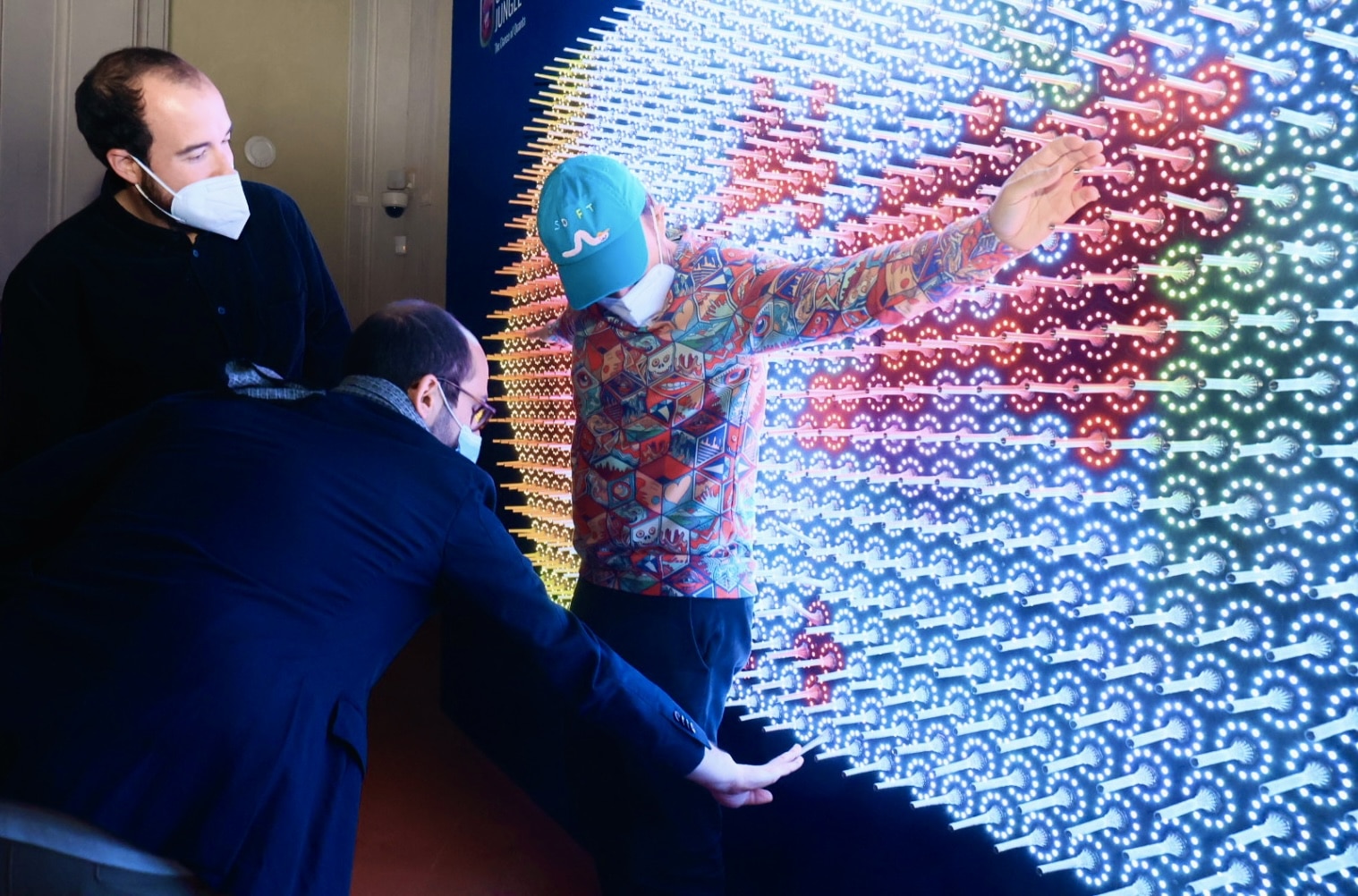“L’ho concepita, costruita e programmata a Berlino – spiega Baumgarten – nell’ultimo anno, in stretta collaborazione con gli scienziati di Helsinki e Pisa. L’installazione è composta di più di 1.000 molle sensibili al tatto, 12 mila led indirizzabili individualmente, circuiti stampati e legno. E’ progettata in modo modulare per poter essere riusata e montata in forme e dimensioni differenti, a seconda del contesto espositivo. Per la sua premiere a Palazzo Blu, sarà nella sua configurazione più grande mai realizzata, consegnandoci di fatto uno stupefacente, luminosissimo schermo di fisica quantistica“.