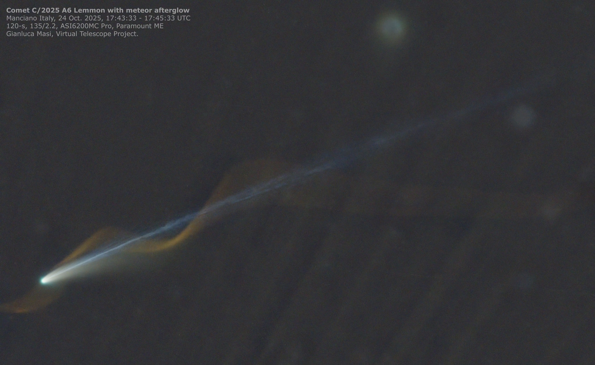 Gianluca Masi responsabile scientifico del Virtual Telescope Project ha raccontato: “Un’immagine irripetibile. Durante la sessione di imaging della cometa C/2025 A6 Lemmon nella serata del 24 ottobre, ho avuto la fortuna di assistere a un fenomeno davvero affascinante, che per puro caso sono riuscito a immortalare. Tra le 17:39:30 e le 17:41:30 UT, una meteora ha attraversato proprio la regione del cielo in cui era visibile Lemmon. In quel momento, una sequenza di immagini a campo largo veniva acquisita utilizzando l’astrografo che fa parte della strumentazione del Virtual Telescope Project, installato a Manciano (Grosseto), nella splendida regione della Maremma. Nell’inquadratura scattata tra le 17:43:33 e le 17:45:33 UT, è chiaramente visibile la scia persistente lasciata dalla meteora, con una distinta tonalità rossastra. Il fenomeno è associato alla ionizzazione dell’ossigeno molecolare nell’atmosfera causata dall’evento meteorico, seguita dalla sua ricombinazione, che produce l’emissione di luce a quella lunghezza d’onda. In questa fotografia, il bagliore residuo della meteora sembra avvolgersi attorno alla coda ionica della cometa: un puro miracolo prospettico, poiché il primo è un effetto atmosferico indotto dalla meteora, mentre la cometa stessa si trovava a circa 100 milioni di chilometri di distanza. Non avevo mai documentato nulla di simile prima d’ora, e il fatto che sia successo proprio davanti a una cometa così straordinaria come la C/2025 A6 Lemmon lo rende ancora più straordinario.”