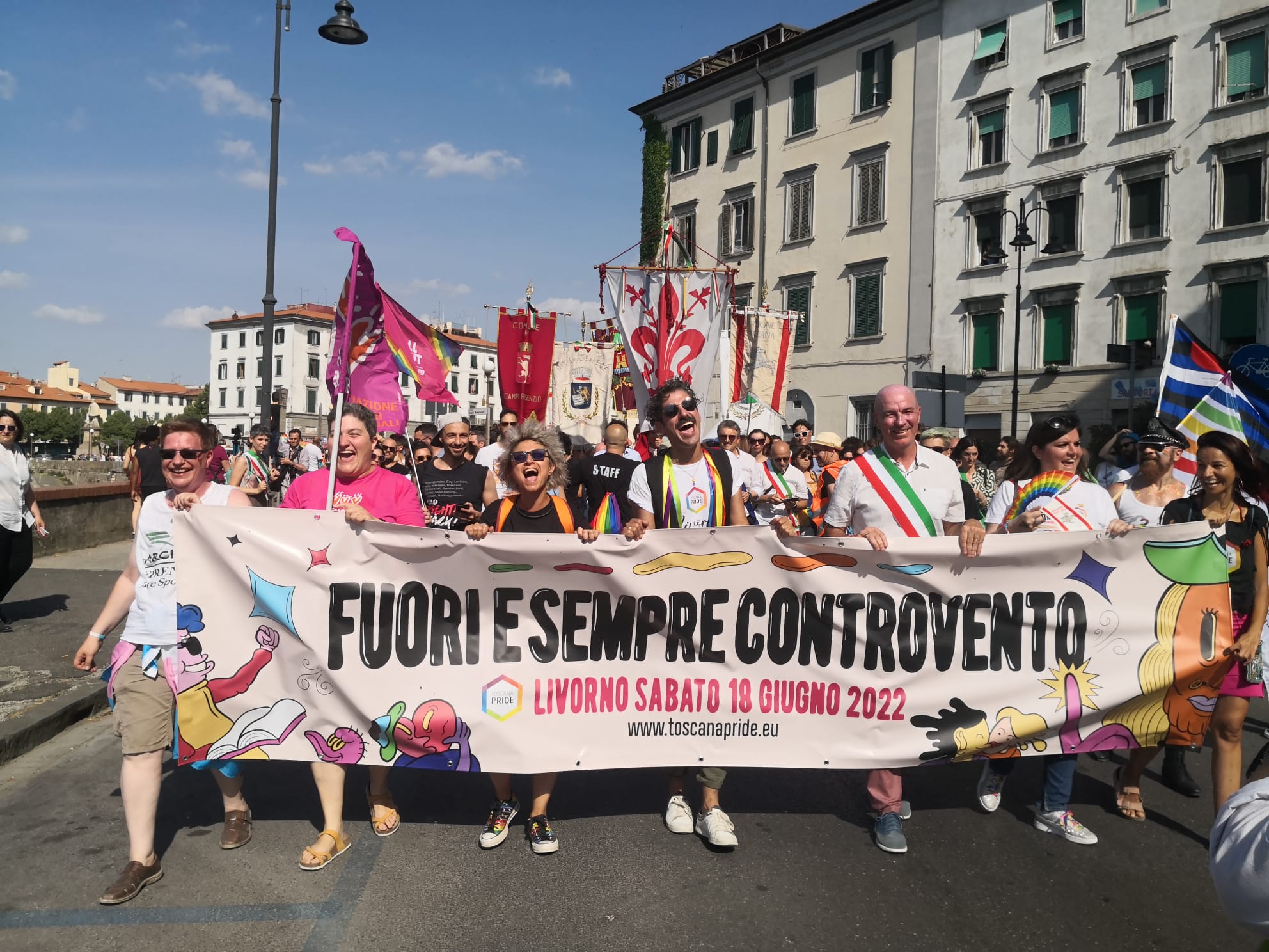 Giovani, meno giovani, famiglie, bambini e turisti hanno partecipato al corteo arcobaleno alla testa del quale a tenere lo striscione del Comitato organizzatore, c’erano anche il sindaco della città Luca Salvetti e l’assessora regionale Alessandra Nardini che ha la delega alle pari opportunità e all’attuazione della legge regionale contro le discriminazioni per orientamento sessuale e identità di genere, accompagnata dal Gonfalone della Regione, insieme a oltre 130 istituzioni che hanno dato il patrocinio alla manifestazione.