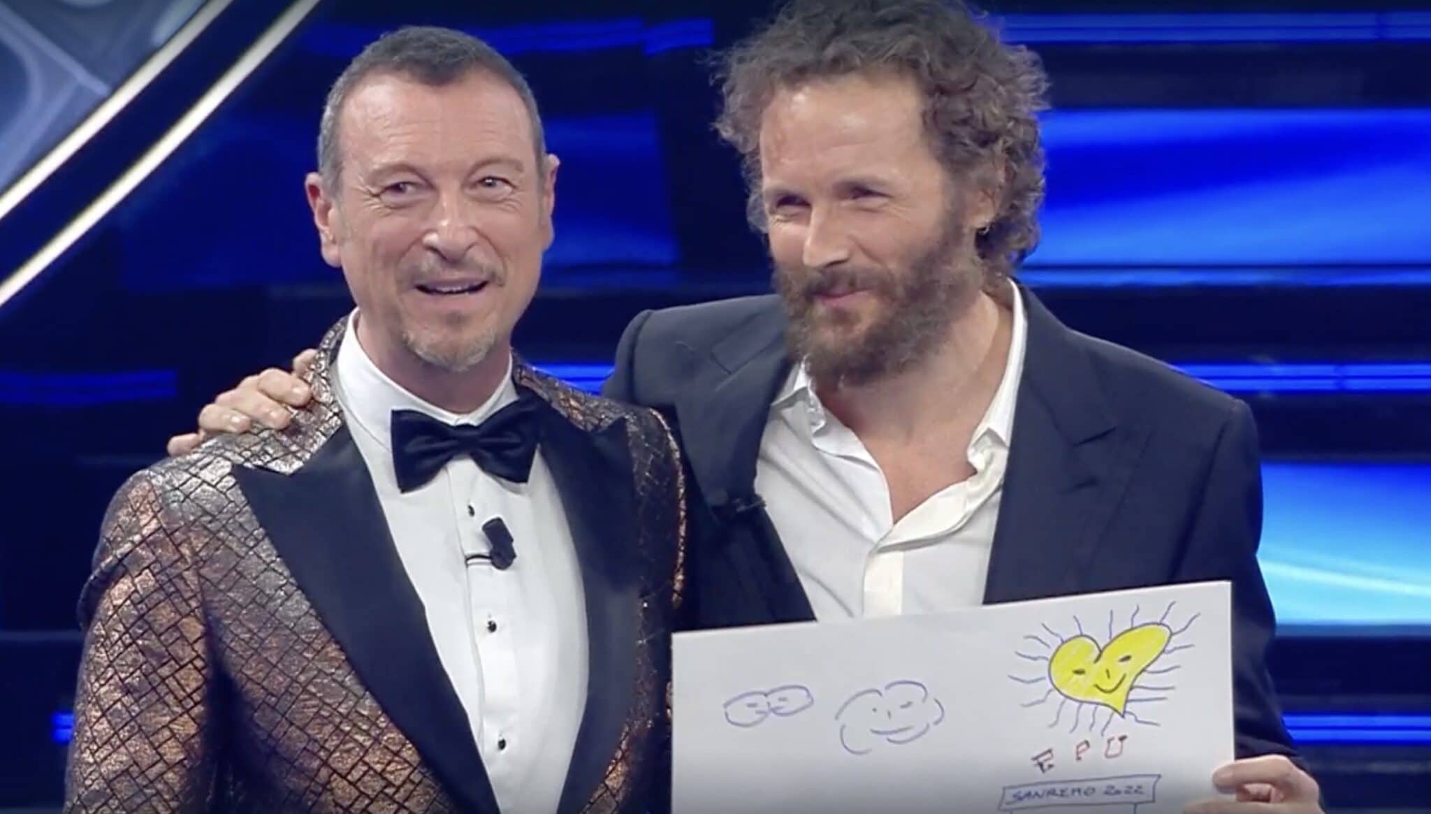 E mentre Amadeus disegnava, Jovanotti ha letto una poesia di Mariangela Gualtieri, “Bello mondo” che chiude con un omaggio a Dante: “E infine ringraziare desidero/ per la gran potenza d’antico amor/ per l’amor che se move il sole e l’altre stelle./ E muove tutto in noi“.