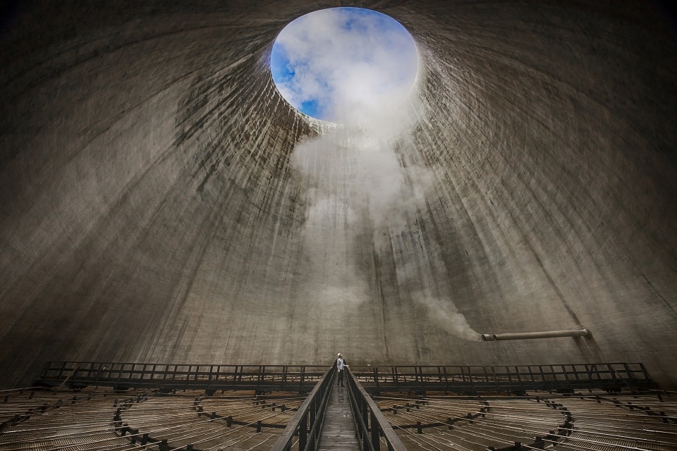 La foto immortala un tecnico Enel all’interno della grande torre dalla forma iperbolica, a tiraggio naturale, che nella parte finale del processo di produzione geotermica raffredda il vapore per poi reiniettare l’acqua nel sottosuolo e mantenere in equilibrio il ciclo rinnovabile della geotermia.