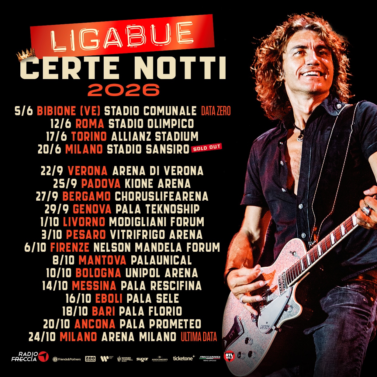 Il tour toccherà 14 città per 14 appuntamenti unici che renderanno ogni “notte” irripetibile; una grande festa che partirà il 22 settembre dall’Arena di Verona e che si concluderà il 24 ottobre all’Arena Milano, ultima data live di Ligabue per il 2026.
