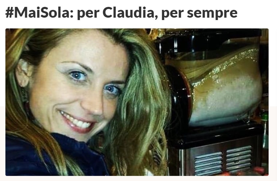 “Un destino inimmaginabile e crudele ci ha portato via Claudia. Dopo il dolore, dopo la rabbia, ci siamo chiesti tutti cosa possiamo fare per la sua piccola. Con questa raccolta, totalmente trasparente, vogliamo creare un piccolo fondo da poterle donare per tutte le necessità che da ora in poi potrà avere. Un piccolo gesto che vuol essere di supporto a chi si prenderà cura di lei, da oggi in poi. Non importa quanto, se un euro, due o cento. L’importante è esserci, lasciare un pensiero, fare un piccolo gesto. Per Claudia, per sempre.#MaiSola”