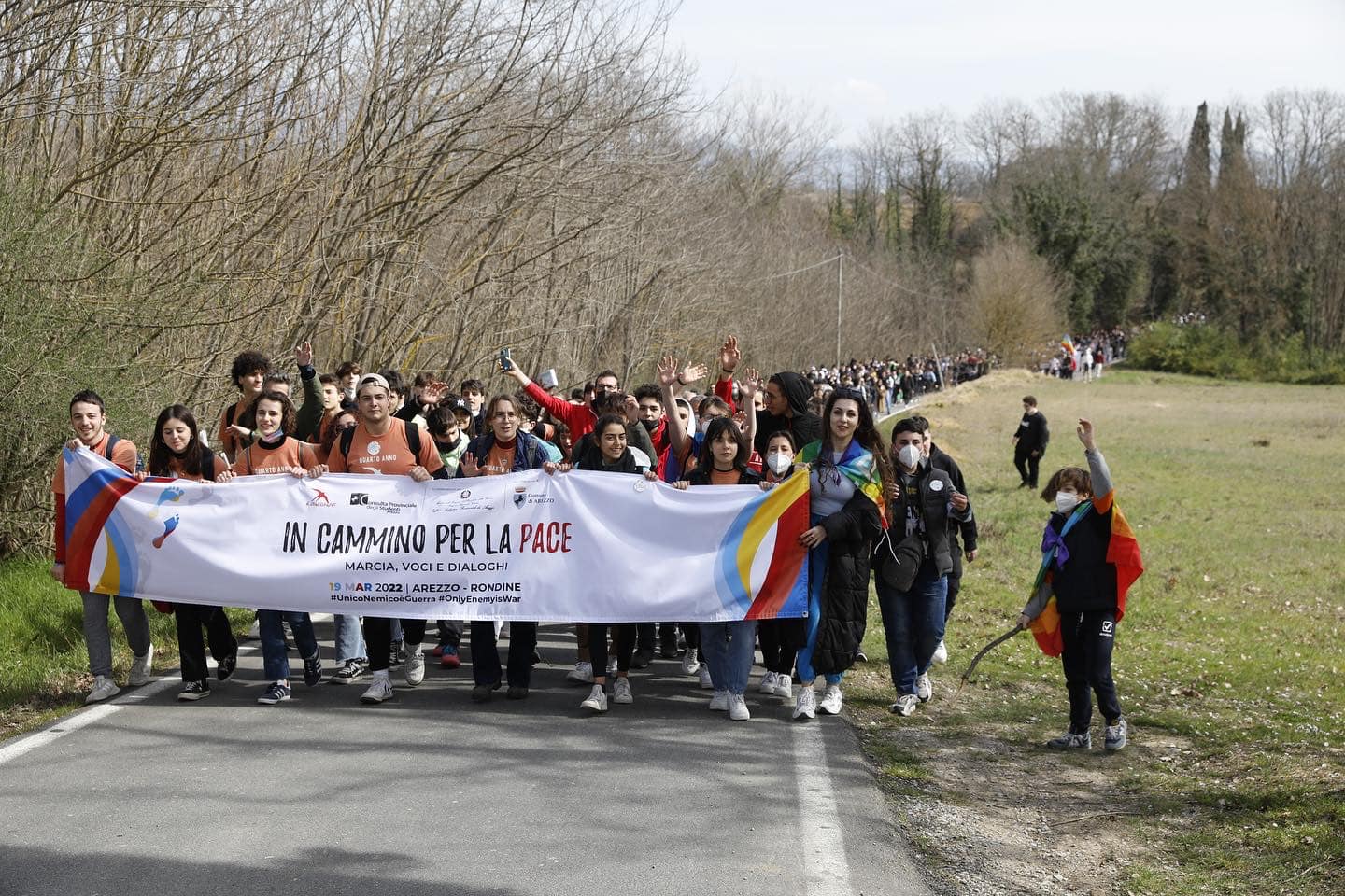 Sono partiti da Arezzo in 1.500 e sono arrivati a Rondine Cittadella della Pace in 4mila, in una marcia colorata e pacifica, per dire no alla guerra. Oltre agli studenti e ai tanti sindaci presenti, guidati dal primo cittadino di Arezzo Alessandro Ghinelli, all’arrivo era presente il presidente delle confederazione delle Misericordie, Domenico Giani, appena tornato dall’Ucraina. Con loro, in collegamento telefonico, anche la senatrice a vita Liliana Segre.
