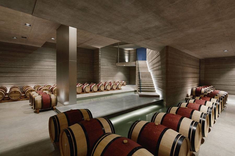 La cornice architettonica della cantina è stata realizzata con calcestruzzo gettato in opera. All’interno predominano linee nette in vetro e acciaio, bilanciate dalle lunghe file di botti di rovere. Le vaste superfici ruvide e intagliate sono il simbolo del processo estrattivo da cui è nata l’opera, mentre le aperture nelle pareti lasciano intravedere i profili verticali dell’inconfondibile argilla blu che contraddistingue il suolo di questo vigneto. Il cuore della struttura è occupato dalla prestigiosa cantina dei vini della Tenuta, il Caveau Masseto.