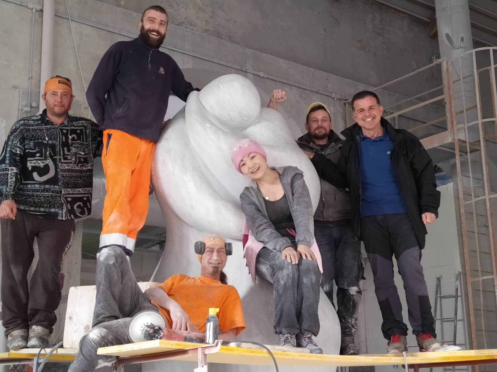 Ma a differenza di quella destinata al Giappone, l’opera americana è stata realizzata con un composto di resine e polvere di marmo. Totalmente in marmo, invece, questa nuova versione di “Lovers”. I cavatori della Cooperativa Gioia hanno dovuto estrarre un blocco su misura. “Un’operazione non semplice – spiega Anselmo Ricci, presidente della cooperativa – perché lo scultore ha già in mente la propria opera e la ‘vede’ nella montagna. E noi cavatori dobbiamo saper individuare esattamente le stesse cose, le stesse misure, le stesse dimensioni, le stesse profondità. Abbiamo lavorato come dei sarti confezionando un vestito su misura per Minako”.