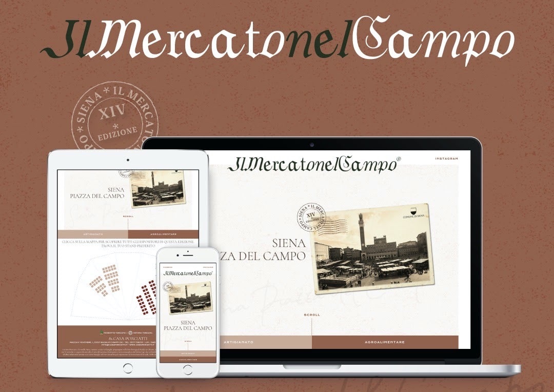 Voluto e progettato da Confcommercio e Confesercenti Siena, con il contributo della Camera di Commercio di Arezzo-Siena: il portale www.mercatonelcampo.it è immaginato per permettere a chi lo naviga un’esperienza assolutamente coinvolgente: tra le novità più curiose, la mappa interattiva degli espositori distribuita sul disegno stilizzato di Piazza del Campo come se l’edizione si fosse svolta dal vivo.
