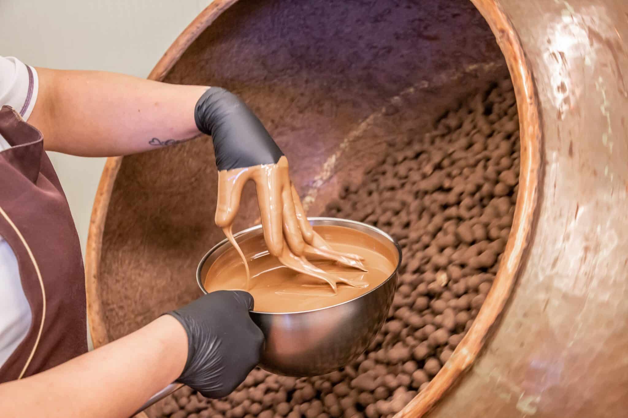 A questo punto, dopo la miscelazione, fase in cui vengono aggiunti altri ingredienti, avviene una nuova raffinatura. Si passa nella conca, apparecchiatura dove la pasta di cioccolato raffinata viene agitata e rimescolata a temperatura controllata. Un modo per amalgare tutti gli ingredienti alla perfezione.