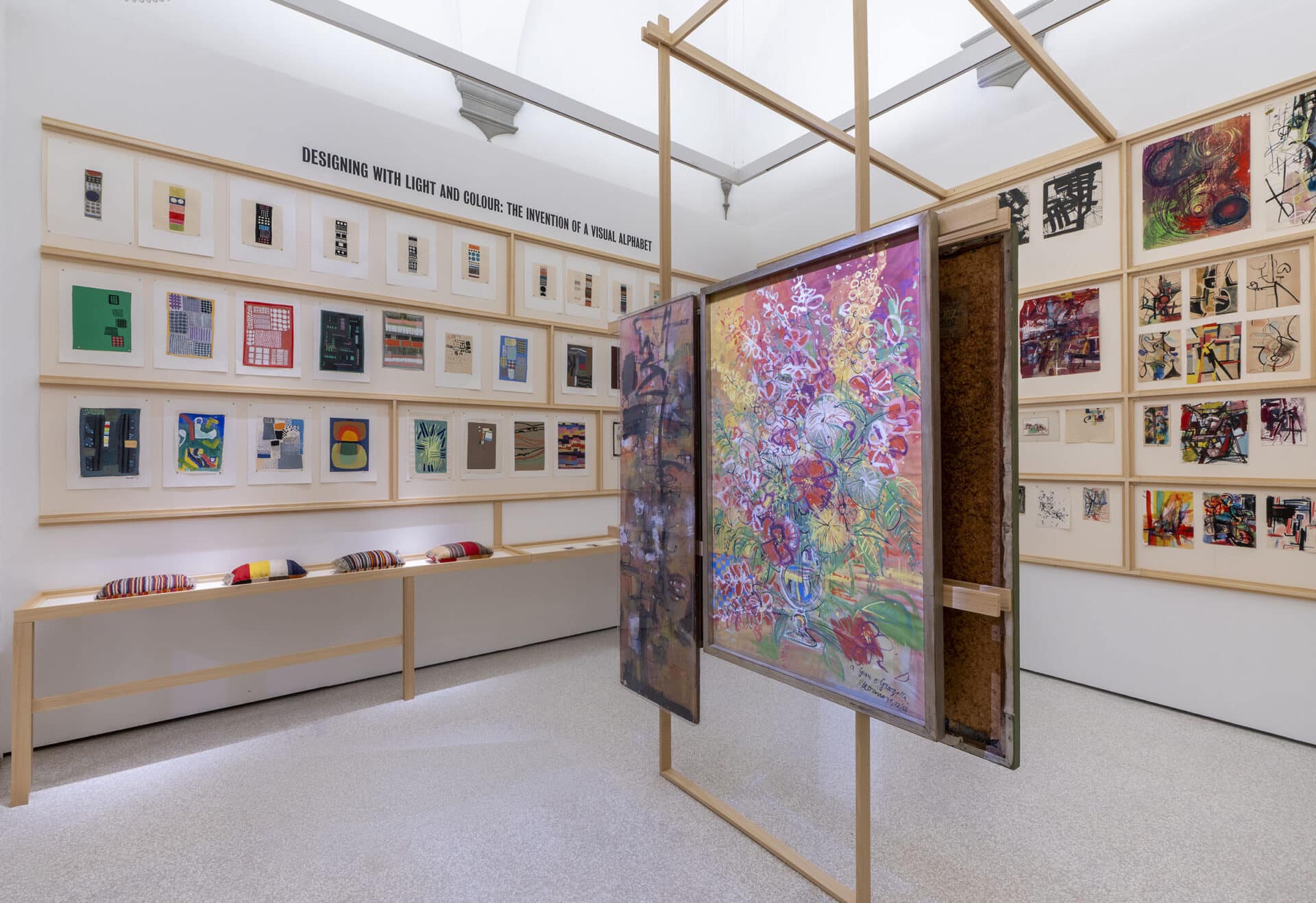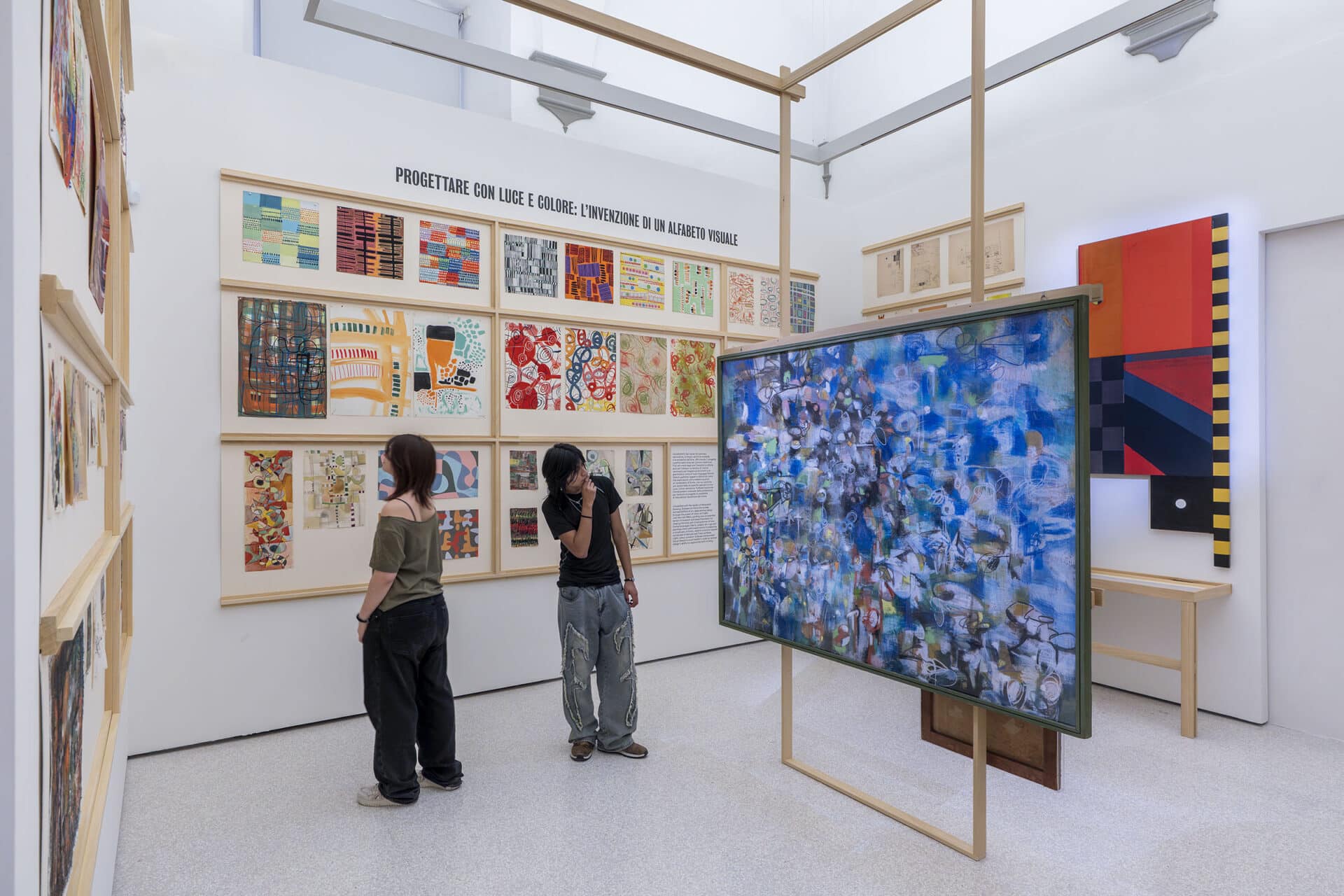 L’itinerario si apre con le sue ricerche artistiche, terreno su cui sviluppa un linguaggio libero dai vincoli del razionalismo, fondato sulla forza del gesto, del colore e della luce, che si estende dalla pittura al disegno fino ai progetti per tessuti e tappeti.