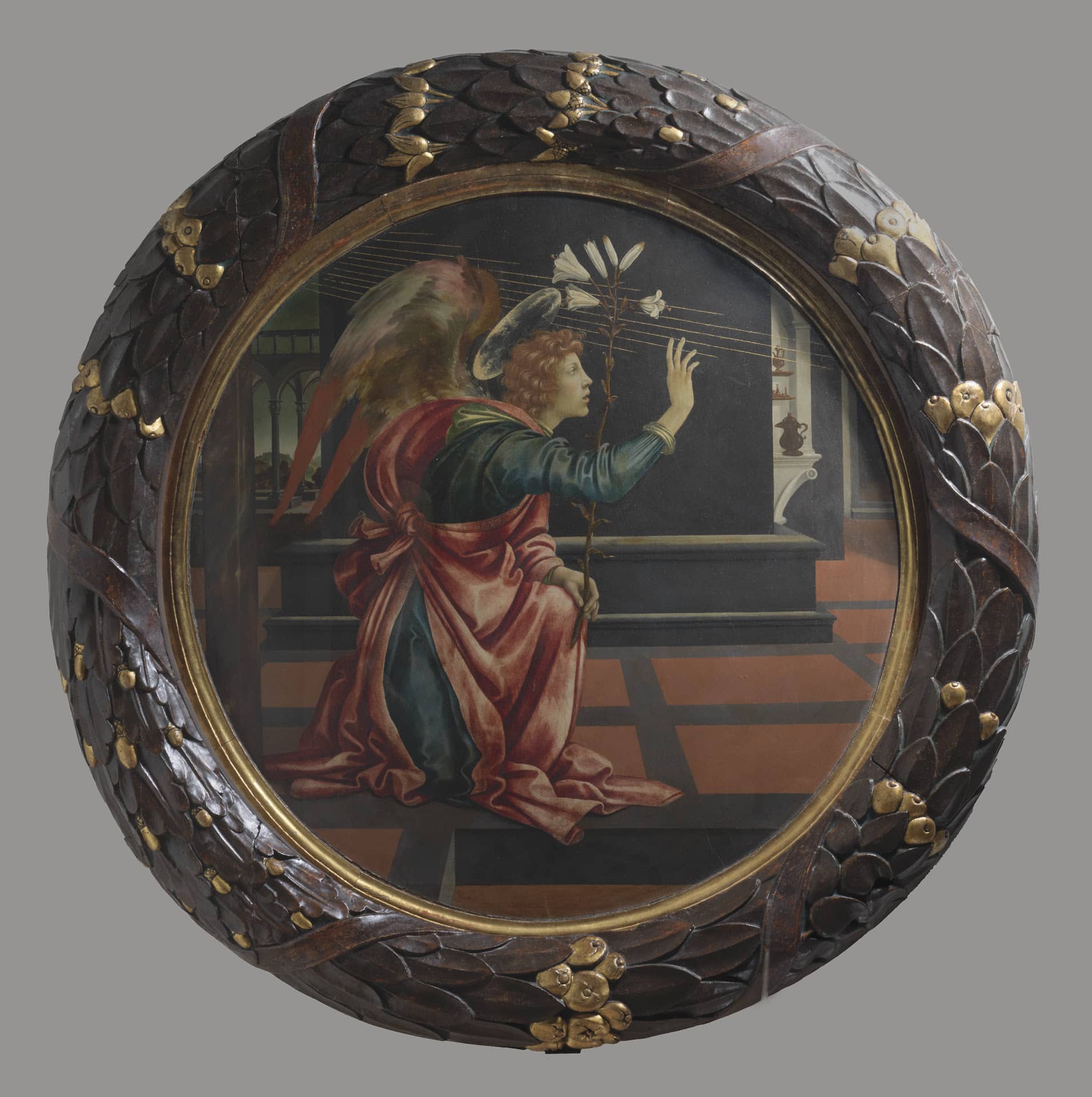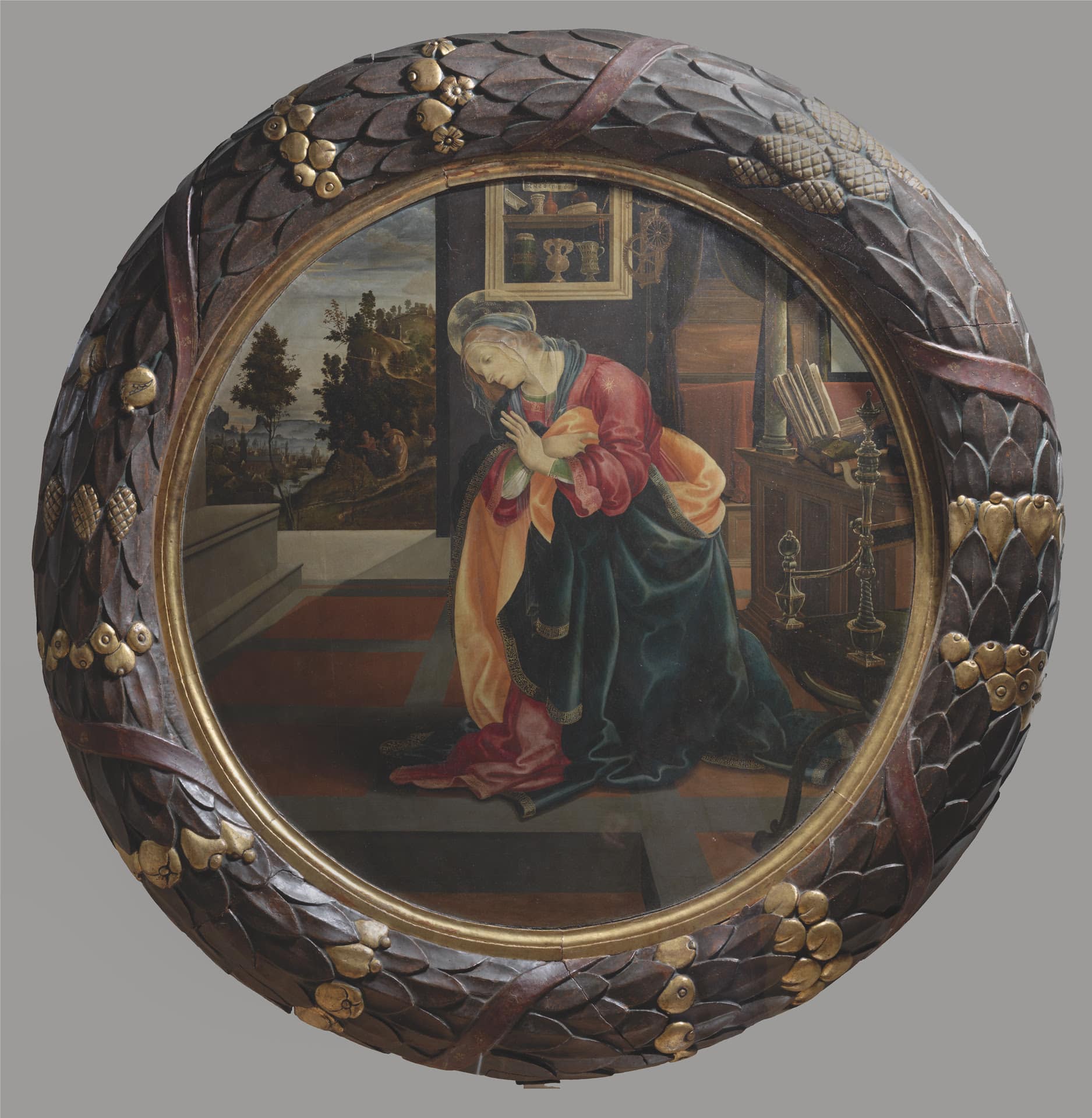 Quell’anno Filippino Lippi concepì i due tondi distinti raffiguranti l’Annunciazione, mentre le cornici con decorazione a intaglio di foglie di quercia e alloro con ghiande e bacche furono realizzate intorno al 1490 da Antonio da Colle, un artigiano a cui si attribuiscono anche il pulpito e il coro ligneo della Collegiata di San Gimignano.