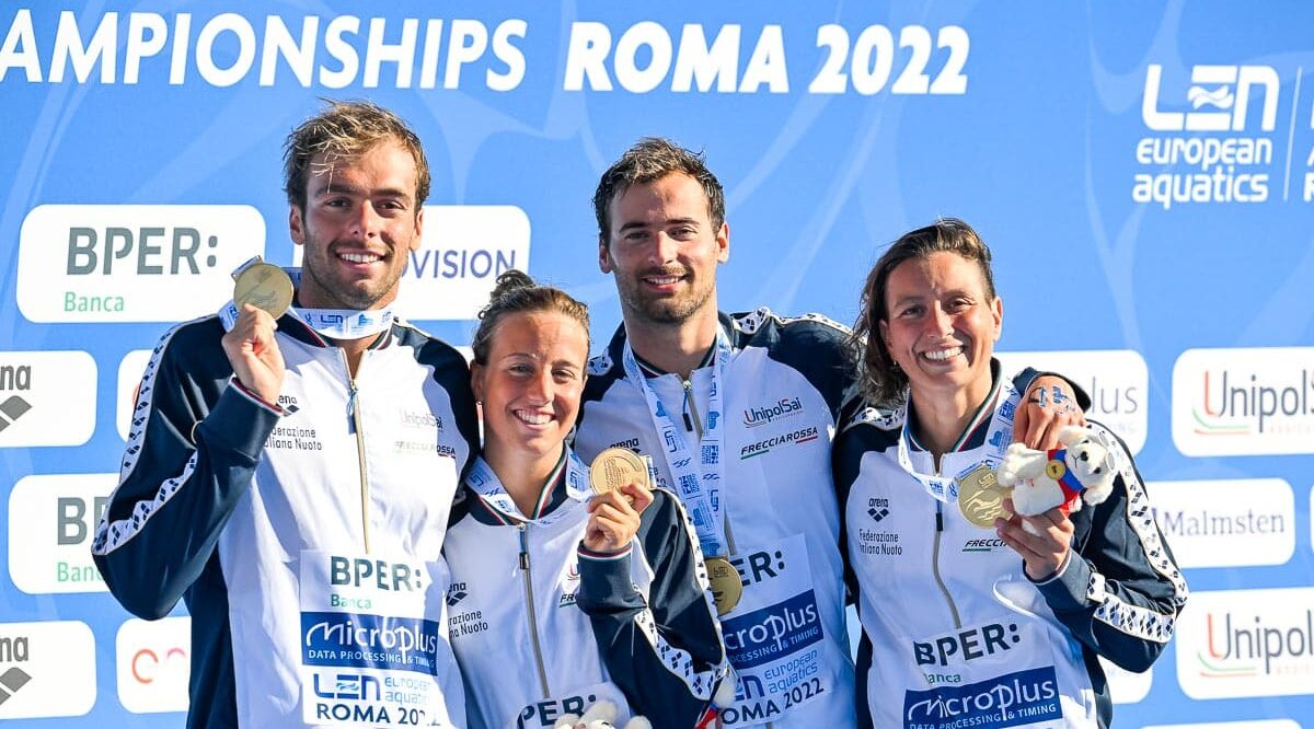 Un lieto fine, come nelle favole. Per le ragazze toscane una medaglia d’oro, che vale doppio, e una d’argento nell’ultima giornata degli Europei di nuoto di Roma. L’Italia vince così nella 4×1250 in acque libere con la stellare staffetta azzurra composta in prima frazione dalle fiorentine Rachele Bruni e Ginevra Taddeucci e poi da Gregorio Paltrinieri e Domenico Acerenza. Con il tempo di 59’43″1 chiudono la gara di Ostia davanti all’Ungheria e alla Francia.