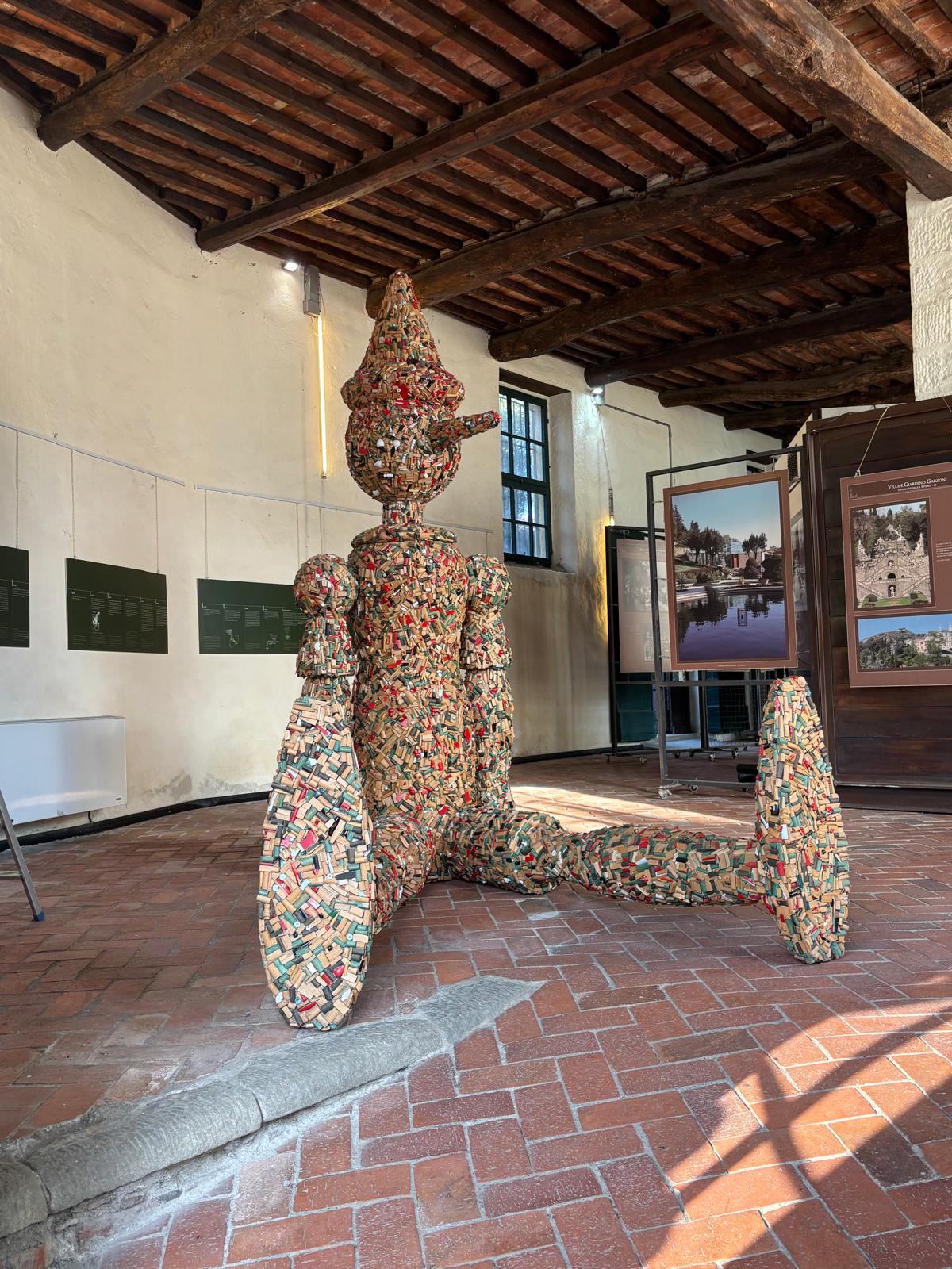 Il “Pinocchio di Pinocchi”, di quasi 6 metri, installato temporaneamente all’ingresso del Giardino Storico Garzoni, è un’opera di Edoardo Malagigi, artista e già docente all’Accademia di Belle Arti di Firenze, che ha fatto della rigenerazione dei materiali la sua poetica artistica.