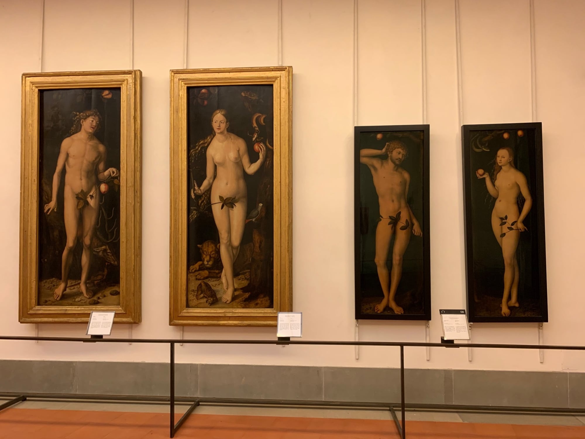 Adamo ed Eva a confronto con Adamo ed Eva: è quanto avviene nella sala 45 al secondo piano degli Uffizi, dedicata alla pittura del Rinascimento Nordico, grazie al nuovo allestimento, con 9 dipinti aggiuntivi rispetto ai 14 finora esposti. Così ora l’Adamo e l’Eva a grandezza naturale del tedesco Hans Baldung detto Grien, che da 10 anni era in deposito, è stato messo a fianco in dialogo diretto con un’altra celebre coppia di dipinti dello stesso soggetto, l’Adamo ed Eva di Lukas Cranach il Vecchio.
