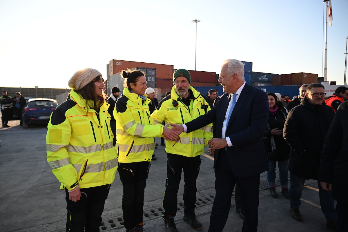 La banchina è il porto sicuro che li accoglie, i cittadini gli danno il benvenuto con applausi e uno striscione: nessuno è straniero. Altri protestano contro lo sbarco. La nave di salvataggio della ong Sos Mediterraneé, battente bandiera norvegese, è arrivata alle 15.20, i primi sbarchi sono avvenuti due ore dopo. A terra, ad attenderli, la Protezione civile regionale, le forze di polizia, operatori e volontari che hanno preparato tutto in poco tempo, poi il presidente della Regione Toscana Eugenio Giani, l’assessora alla protezione civile Monia Monni e l’assessora al sociale Serena Spinelli.
