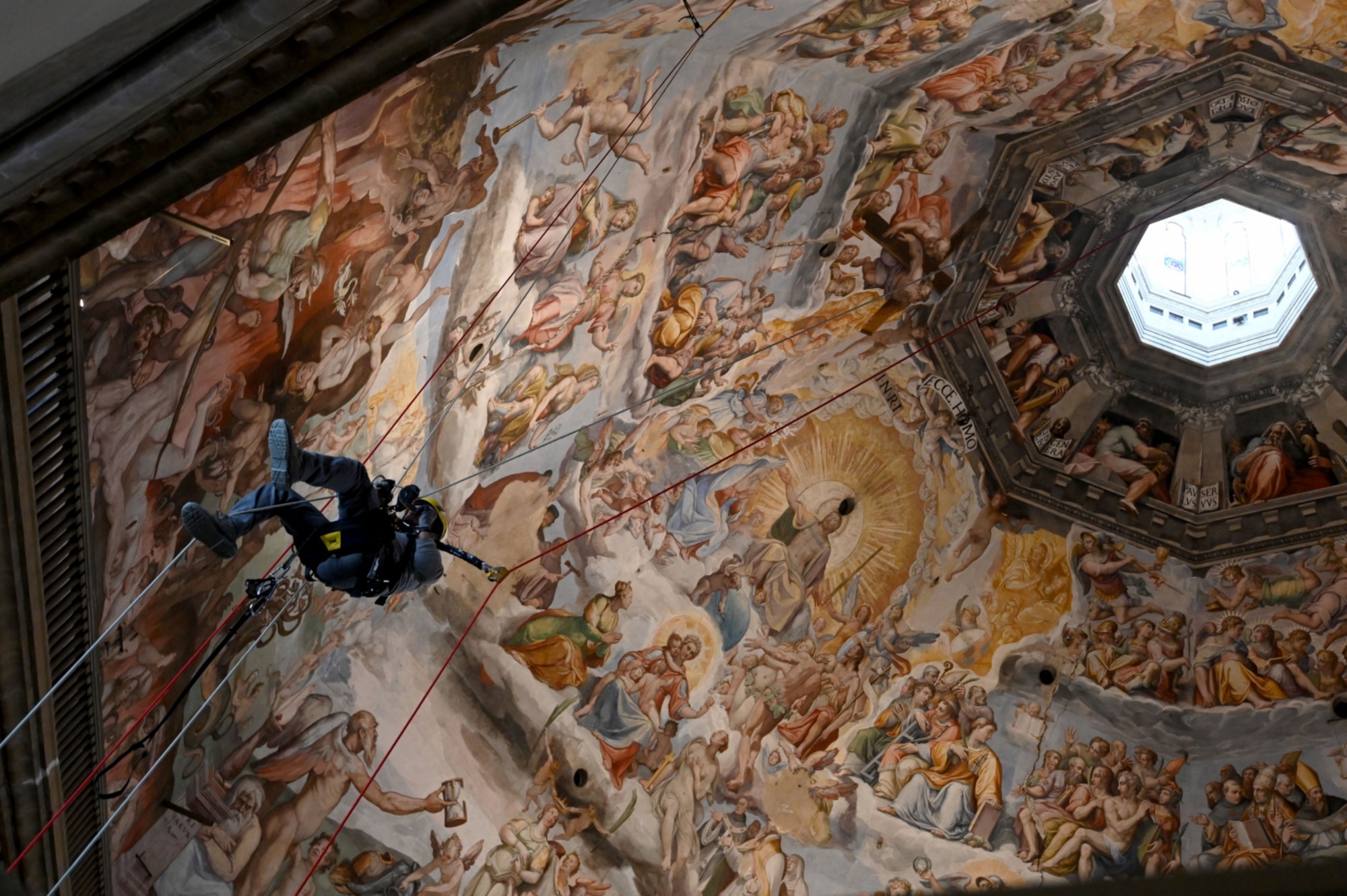 Sono in corso i lavori di monitoraggio delle pareti interne del Duomo di Firenze per verificarne lo stato di conservazione. Per la prima volta operai e restauratori dell’Opera di Santa Maria del Fiore, dopo essersi specializzati nell’ultimo anno in edilizia acrobatica, stanno controllando il Tamburo della Cupola del Brunelleschi a un’altezza di 60 metri come dei veri e propri “alpinisti”.