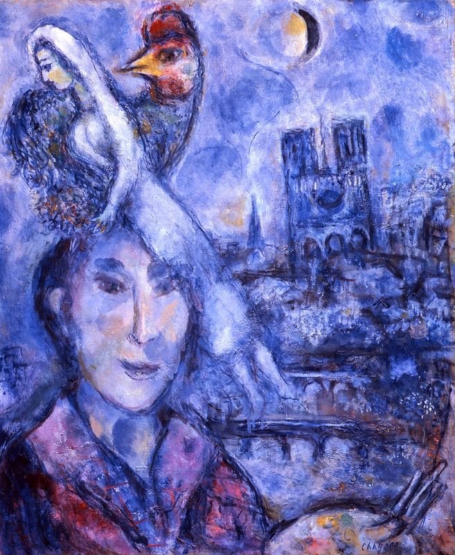 Avvolti nel colore blu, la “tinta della sua anima”, come amava affermare Chagall stesso, nel dipinto compaiono accanto al suo volto tutti gli elementi più cari all’artista: la moglie Bella, il gallo simbolo della sua madre patria Russia, la tavolozza con i pennelli e sullo sfondo Parigi con Notre Dame e il ponte sulla Senna, sotto un cielo che mostra contemporaneamente il sole e la luna.