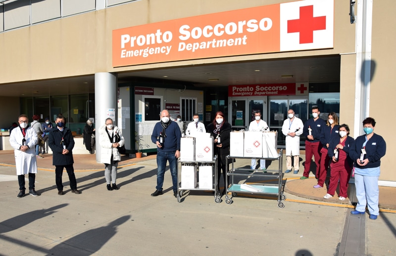 Completamente guarito, Michele Cannoni ha deciso di esprimere la sua gratitudine a medici, infermieri e OSS che lo hanno preso in cura e agli addetti alle pulizie, donando loro 100 bottiglie di Rosso di Montalcino DOC, annata 2017, insieme alla moglie, Barbara Nannetti, titolare di una tenuta vitivinicola nel territorio ilcinese. La consegna è avvenuta alla presenza del direttore generale ff dell’Aou Senese, Maria Silvia Mancini, dei referenti e dei coordinatori infermieristici dell’area Covid.