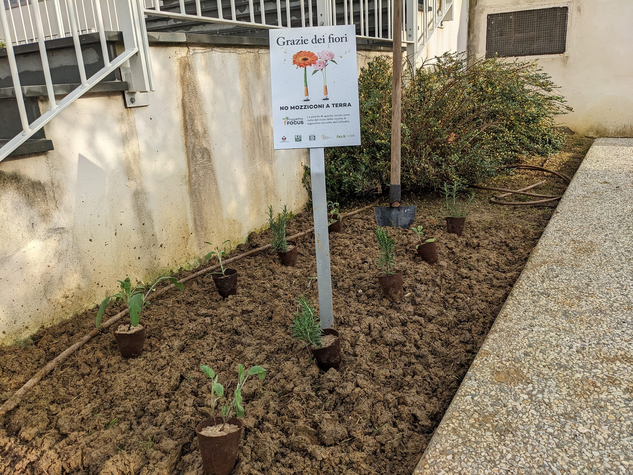Accanto all’aiuola è stato posizionato un cartello con la scritta “Grazie dei fiori. No mozziconi a terra”,  lo slogan della campagna di sensibilizzazione comunale  ontro la cattiva abitudine di gettare le cicche a terra. Oltre a una questione di decoro, infatti,  gettando le sigarette spente negli appositi contenitori (22 in totale) si collabora al progetto di riuso dei rifiuti.