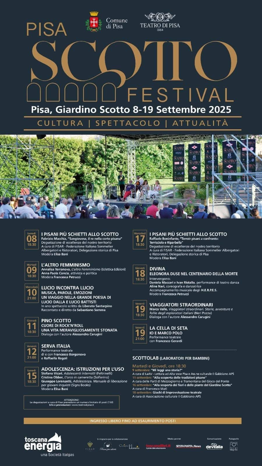 Omaggi a Lucio Dalla, Lucio Battisti ed Eleonora Duse, insieme a dibattiti, musica, teatro e danza: dall’8 al 19 settembre al Giardino Scotto di Pisa torna il Pisa Scotto Festival, rassegna che intreccia cultura, spettacolo e attualità.