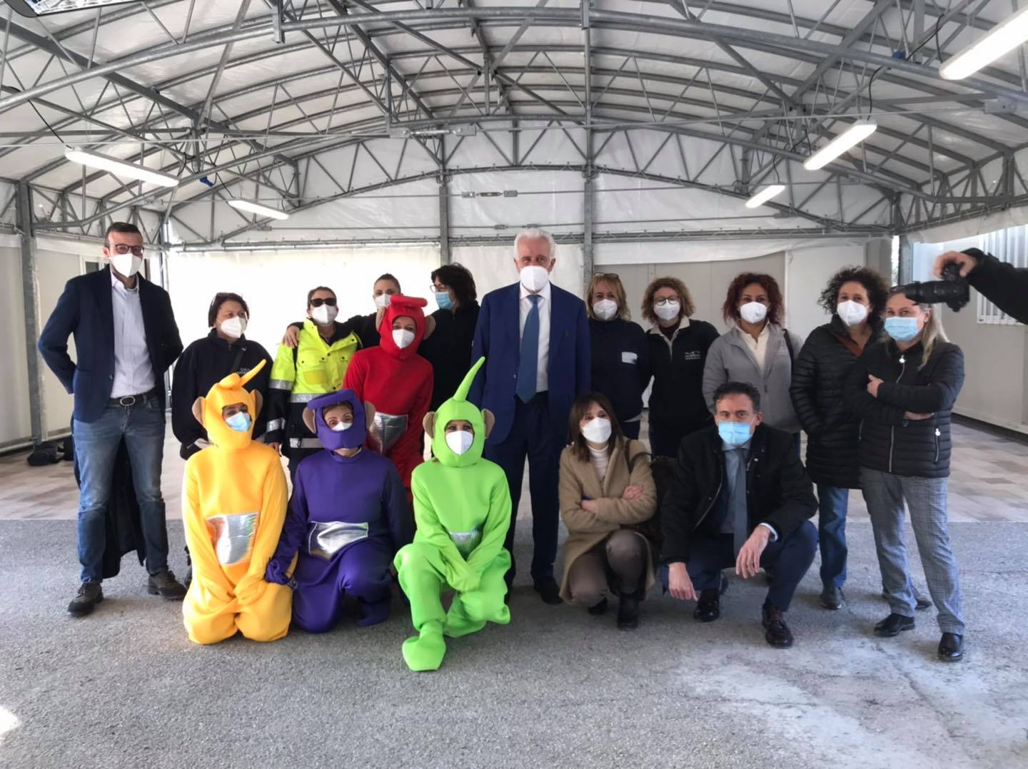 Il presidente della Regione Toscana, Eugenio Giani, durante il sopralluogo al nuovo drive through per i tamponi Covid allestito dall’Asl Toscana nord ovest di Pisa ha ringraziato tutti gli operatori sanitari, con un saluto particolare al team dei “Teletubbies”, composto da un gruppo infermieristico per l’assistenza domiciliare di Pisa, che, mascherato come Teletubbies, accoglie i bambini che devono essere sottoposti al tampone, consetendo di rendere la loro esperienza meno traumatica. “La struttura – spiega una nota dell’Asl – è dotata di due box riscaldati prefabbricati a uso ufficio e spogliatoio con annessi i servizi igienici. Alla tensostruttura si accede tramite viabilità interna suddivisa in due corsie stradali una in ingresso e una in uscita”.