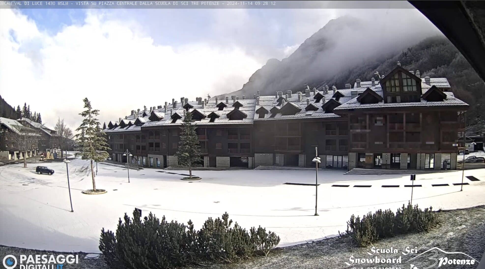 Le immagini arrivano dalla webcam che è installata presso la stazione sciistica della Val di Luce nel comprensorio dell’Abetone a 1.430 mentri sopra il livello del mare, in provincia di Pistoia. L’immagine riprende gli impianti di risalita del Monte Gomito.