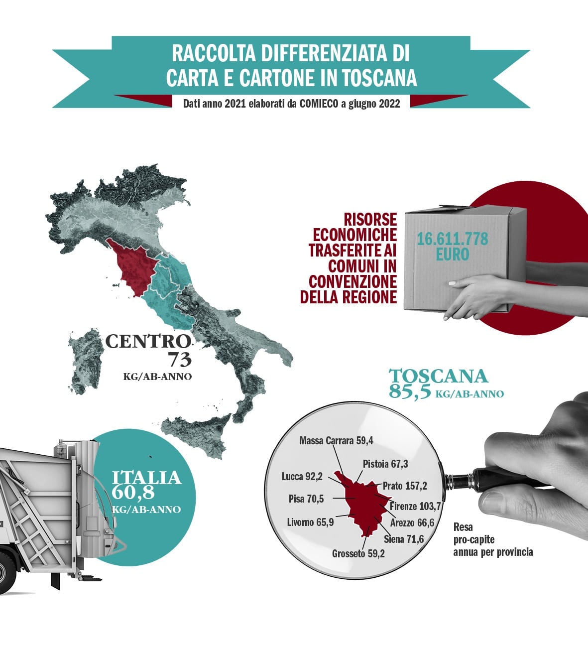 Durante il 2021 in Toscana Comieco ha gestito direttamente 190.882 tonnellate di carta e cartone, pari al 60,8% della raccolta complessiva. Ai 268 comuni convenzionati sono stati riconosciuti corrispettivi per oltre 16,6 milioni di euro.