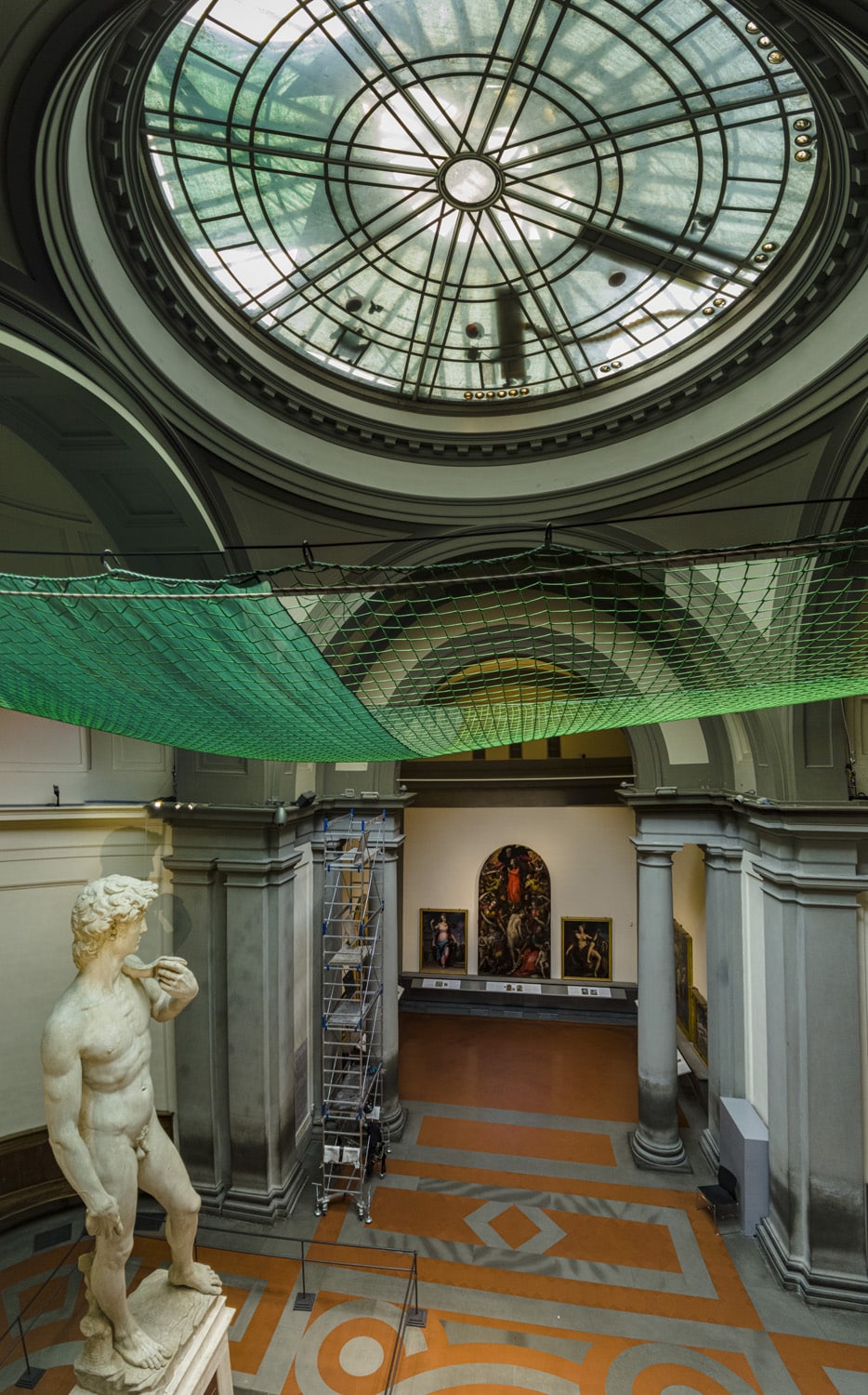 Il cantiere si è svolto per circa sette settimane, nei giorni di chiusura al pubblico del museo, e ha visto all’opera due ditte specializzate che si sono alternate nella realizzazione dei lavori. La prima, ogni domenica sera, nel momento in cui la Galleria chiude le porte e le sue sale si svuotano, si è adoperata per montare una grande rete destinata a proteggere la scultura del David sottostante; l’altra, ogni lunedì, è salita sul lucernario per consolidarne la struttura, lavorando in piena sicurezza grazie all’installazione di un’apposita linea vita.