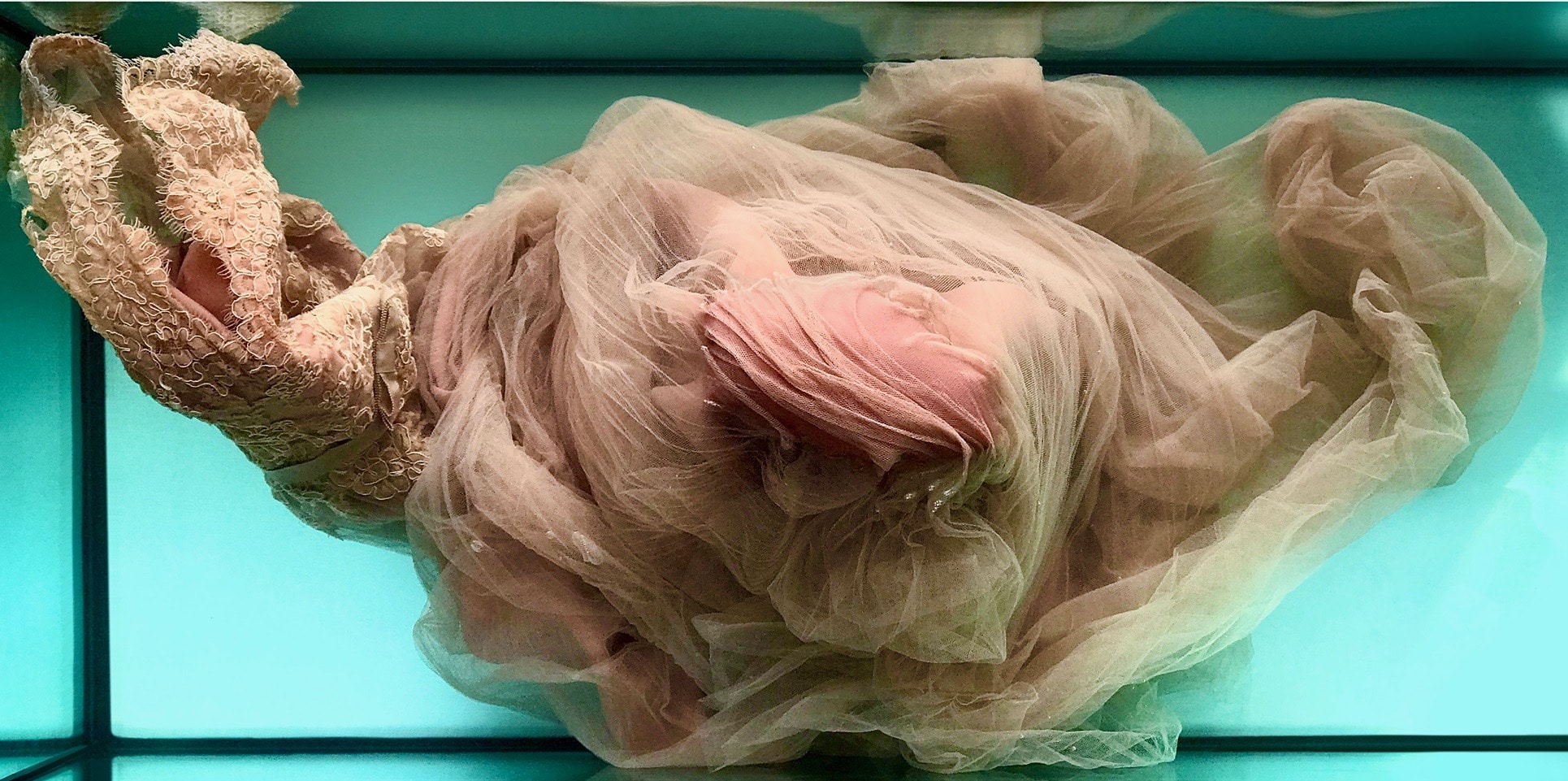 “MUTAZIONI” la mostra fotografia di Lucia Damerino esposta alla Crumb Gallery di Firenze è frutto di un progetto nato durante i mesi di lockdown forzato. È un lavoro fotografico che riflette sulla memoria, sulla storia individuale e famigliare, sui ricordi, a volte anche dolorosi, sulla catarsi che qui avviene attraverso l’azione purificatrice dell’acqua. All’interno di grandi teche di vetro, costruite dalla stessa Damerino, piene d’acqua, fluttuano degli abiti, abiti da sposa della sorella, i vestiti degli zii, del padre, brandelli di una narrazione privata ma allo stesso tempo parte di una storia universale. I vestiti si muovono in modo assolutamente autonomo dai corpi che li hanno abitati, quasi fosse una danza. Sono messaggi in una bottiglia, poesie galleggianti, memorie abbandonate.