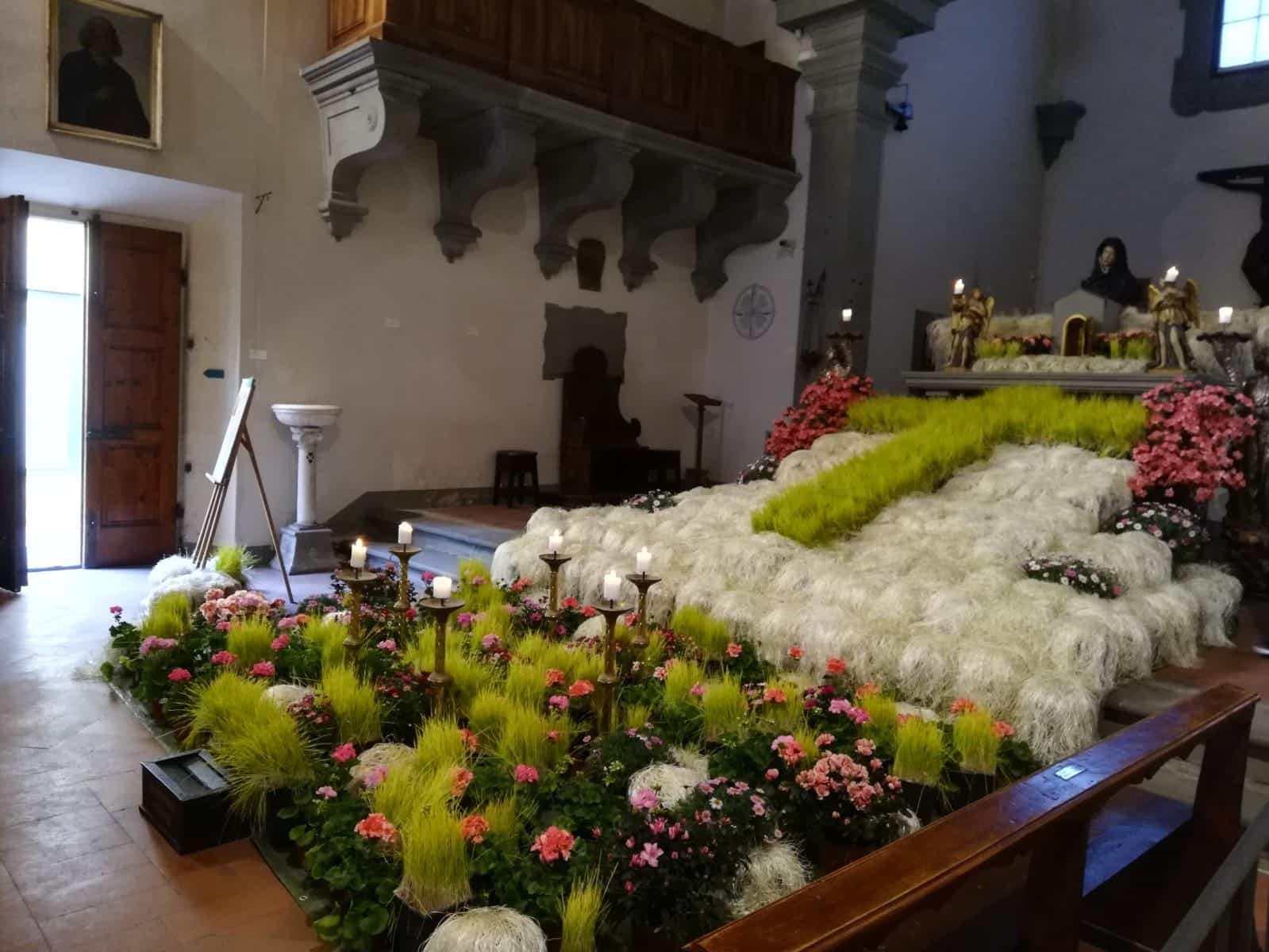 Nella Chiesa di Santa Maria sul Prato (Misericordia) viene allestita una grande croce di grano con vecce di contorno, nella Chiesa di Santa Maria del Gesù (Suffragio) avviene il contrario: in primo piano la croce realizzata con le vecce e il grano che, misto alle piante e ai fiori, fa da sfondo. In entrambe le chiese, oltre alla grande fiorita vengono esposti Gesù Nazareno e Madonna Addolorata, mentre sull’altare trovano spazio i segni della passione: tunica, gallo, dadi, colonna e flagellazione, guanto del tradimento, scala della deposizione.