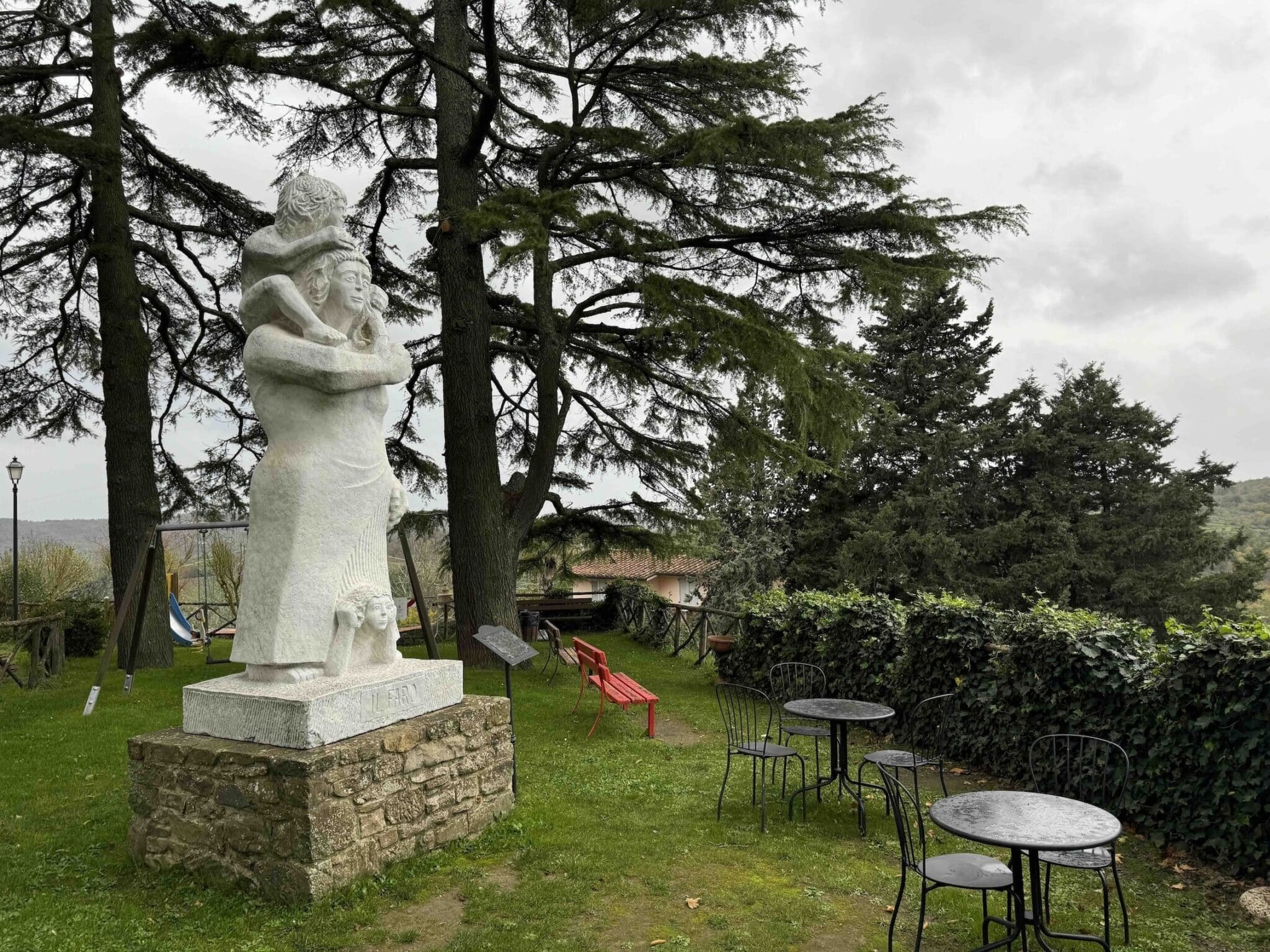 Nel giardino retrostante un roseto in memoria dei civili trucidati. Presente anche una grande statua marmorea opera di Firenze Poggi a ricordo della tragedia. L’opera rappresenta una madre che stringe a sé i figli, mentre osserva l’orizzonte. Sul leggio adiacente compare la scritta: “Qui a perpetuo ricordo dei misfatti della storia, nel luogo segnato dalla tragedia, una madre afferma la vita come un faro sul giardino delle rose…. verso la valle”.
