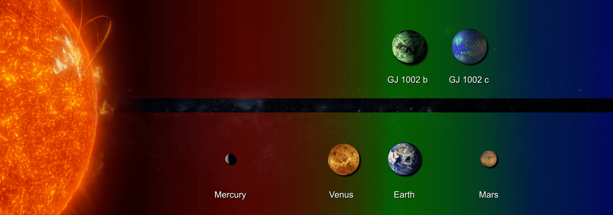 I due nuovi pianeti orbitano attorno alla vicina stella Gj 1002, situata a meno di 16 anni luce di distanza dal sistema solare, in direzione della costellazione della Balena. Entrambi hanno una massa simile a quella della Terra e orbitano a una distanza dalla loro stella ideale per mantenere l’acqua allo stato liquido. Un anno su Gj 1002 b, il pianeta più interno, dura solo 10 giorni: tanto, infatti, il pianeta impiega per completare un’orbita attorno alla sua stella. Il secondo corpo celeste del sistema, Gj 1002 c, più distante, percorre interamente la sua orbita in 21 giorni.